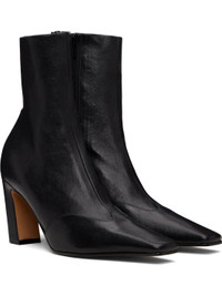 Ankle-high stretch grained lambskin boots. · Pointed square toe · Zip closure at inner side · Covered block heel with rubber injection · Leather sole · Heel: H3.25" Supplier color: Black nappa leather Upper: lambskin. Sole: leather. Made in Italy 252914F113000