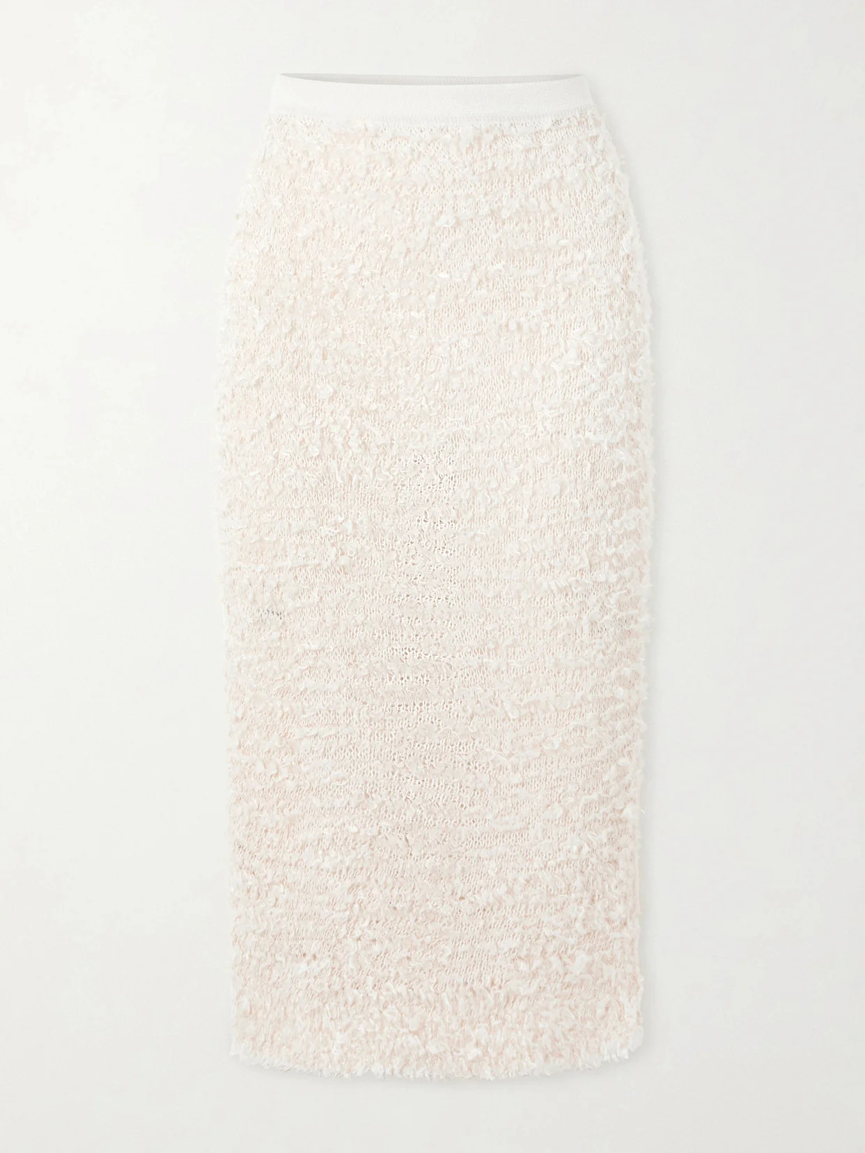 KHAITE's 'Adela' skirt is minimal in silhouette but has a rich texture that does all the talking. It has cotton in the blend for softness, and looks incredibly chic styled with the matching cardigan.