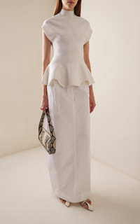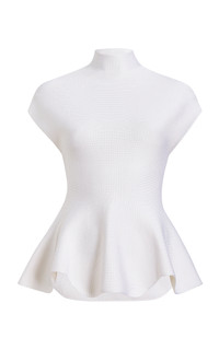 PRODUCT DETAILS - Mock neck, short sleeve, peplum design, slim fit - Slip on - Unlined - Composition: 97% Wool, 2% Polyamide, 1% Polyurethane - Color: Glaze - Dry clean only - Spring/Summer '25