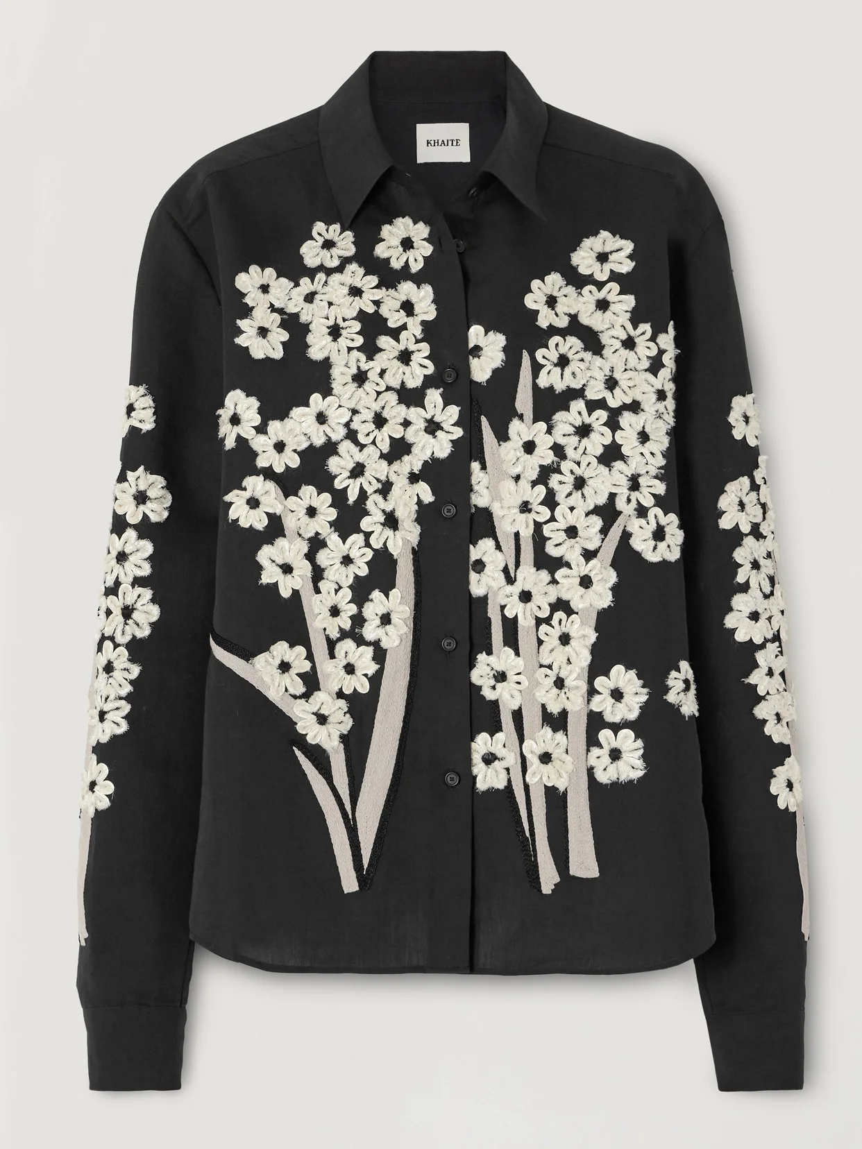 Creative Director Catherine Holstein explores the notion of imperfection for KHAITE's Spring '26 collection. Worn on the runway, this 'Argo' blouse is made from silk and cotton-blend and beautifully appliqued with flowers and leaves. Take cues from the show styling and leave the first few buttons undone.