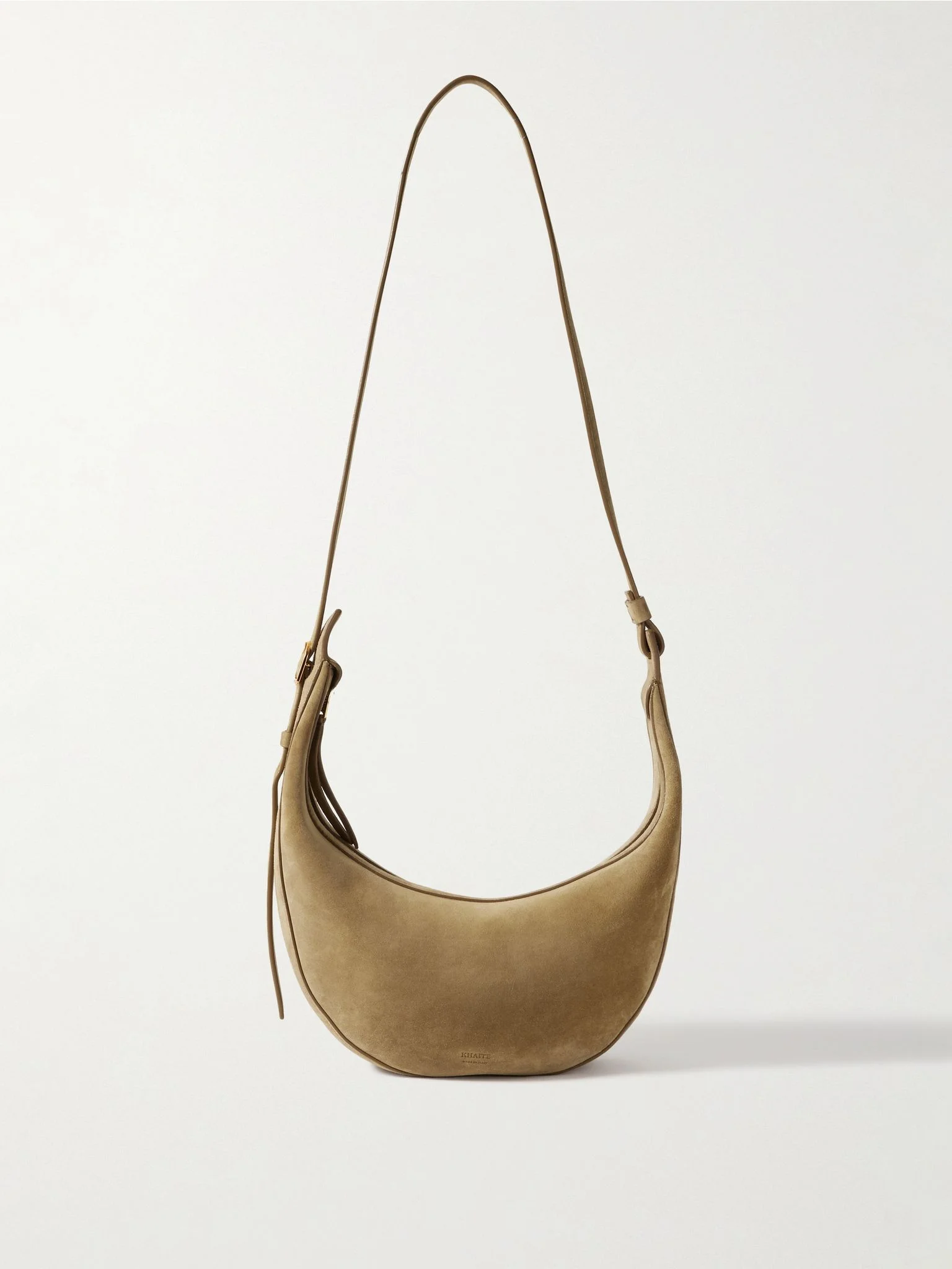 KHAITE's small 'Augustina' bag is designed in a distinct, arching shape that gives it plenty of interest. It's made from suede that's stamped with the logo and has a lined interior with space to fit your phone, cardholder and keys. Details & Care - Tan suede - Adjustable shoulder strap - Leather lining - Zip fastening along top - Designer color: Mud
