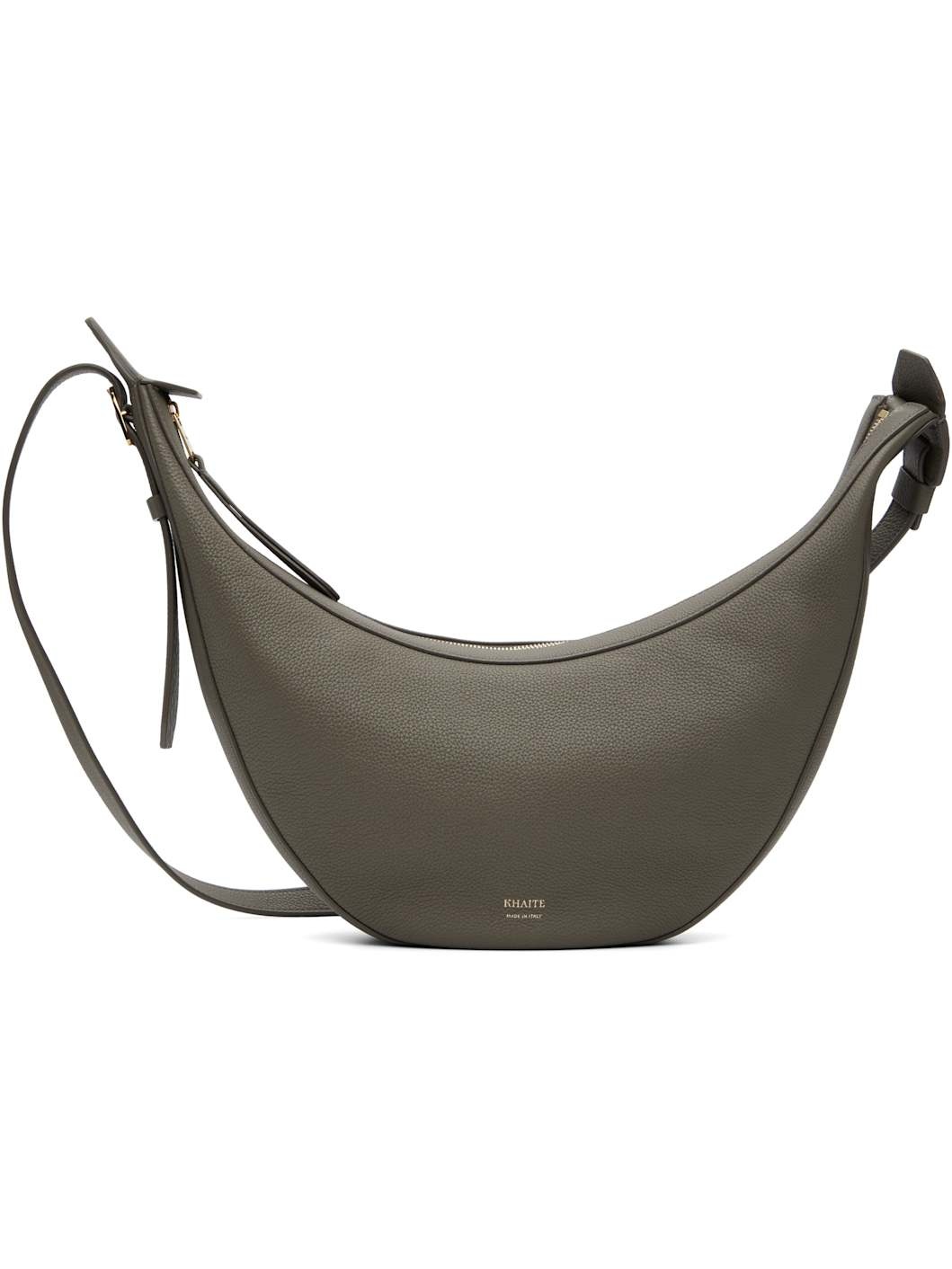 Pebble-grained calfskin shoulder bag. · Adjustable crossbody strap · Logo stamp at face · Zip closure · Suede interior · Unlined · H7" x W15" x D2.75" Supplier color: Elephant Calfskin. Made in Italy 252914F048018