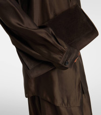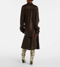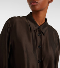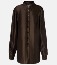 Khaite's minimalist designs exude modern sophistication and effortless elegance. Made in Italy from brown-hued satin, the Auryn shirt is cut to an oversized silhouette with fitted cuffs. Product Details - Material: 86% viscose, 14% silk - Care instructions: dry clean - Made in the USA - Designer color name: Bark - Item color: brown - Collar: classic (Straight point) - Closure: buttoned front - Cuff: one button - Item number: P01077566 Size & Fit - True to size - Straight fit - Non-stretchy fabric - Falls below the hip - Height of model is 175cm-69" and wears a size XS