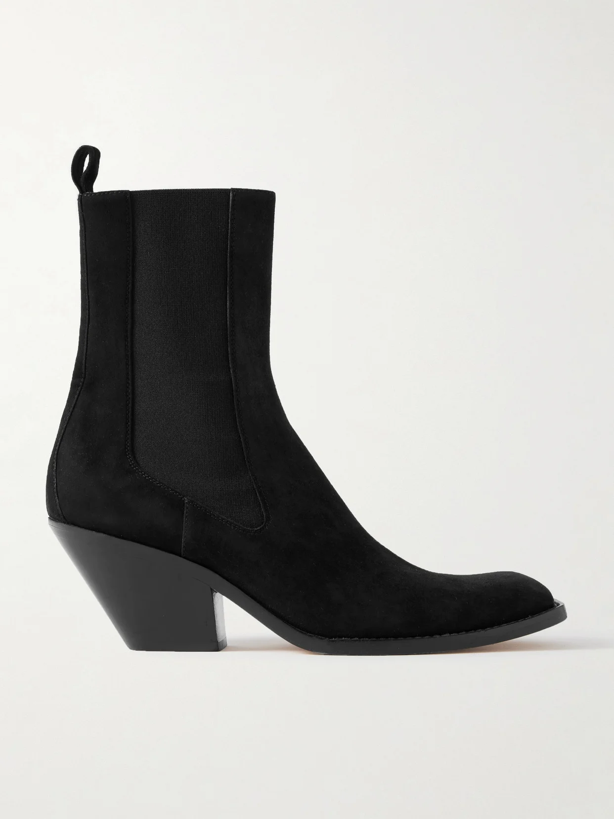 KHAITE's 'Austin' boots rest on softly curved Cuban heels, giving them a Western slant. They're crafted from smooth black suede with elongated toes and minimal topstitching that speaks to the brand's eye for fine details. The elasticated inserts offer easy on-and-off.