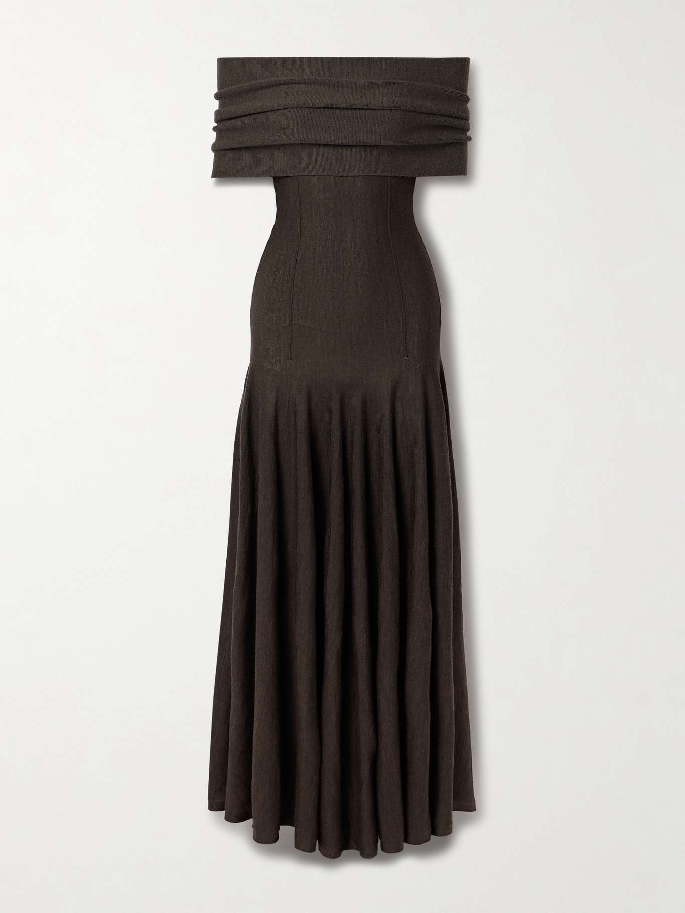 Ava off-the-shoulder pleated wool-blend maxi dress Dark brown