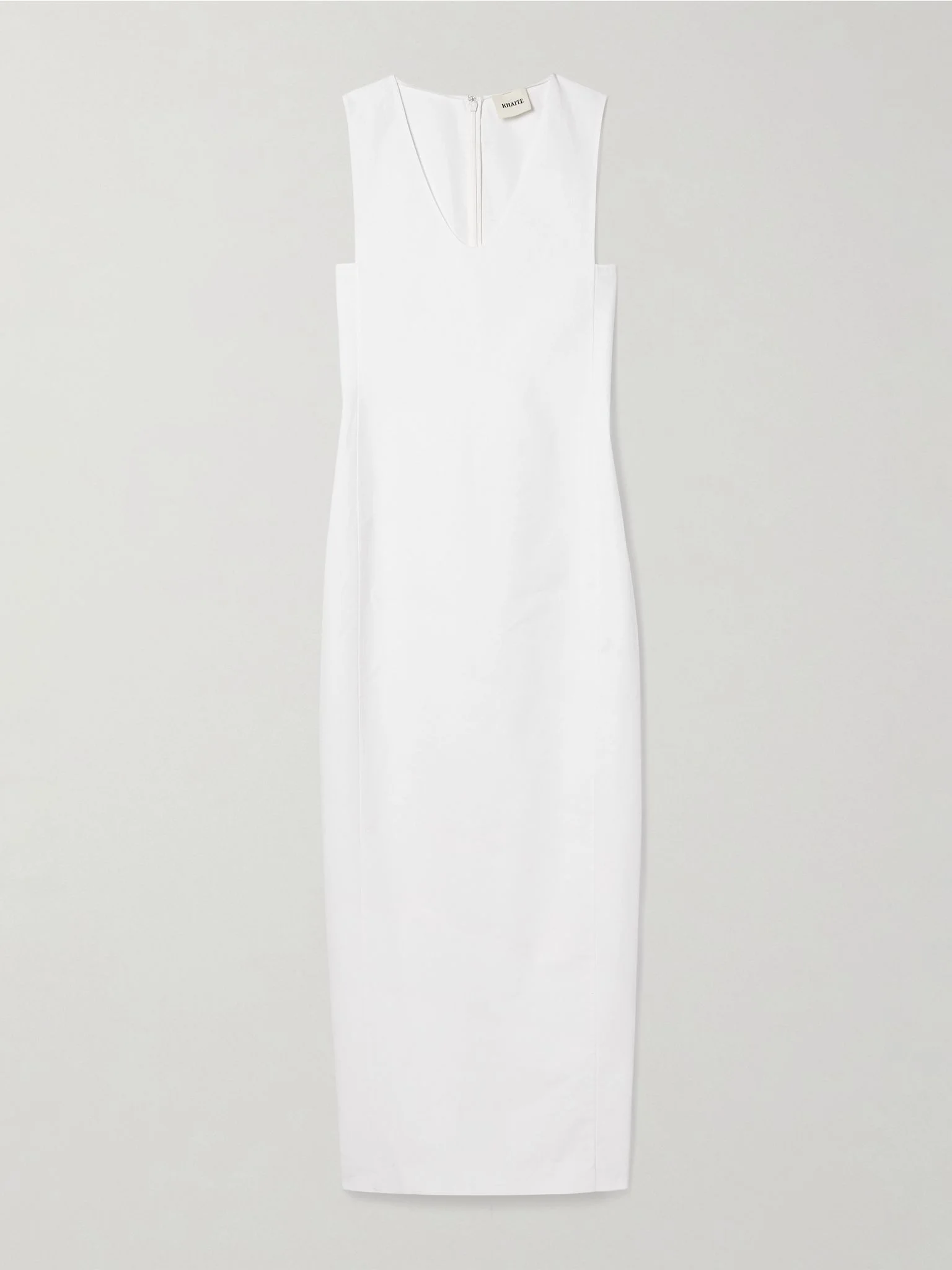 KHAITE's effortless 'Avery' dress is made from white cotton-poplin that's crisp and lightweight. A perfect choice for balmy days, it's cut to closely skim your figure and has a V-neckline and generous back split. Pair it with one of the brand's signature ballet flats. Size & Fit - Fits true to size, take your normal size - Designed for a slim fit - Lightweight, non-stretchy fabric - Model is 180cm/ 5'11" and is wearing a US 2 Model measurements: - Bust: 79cm/ 31" - Waist: 61cm/ 24" - Hip: 89cm/ 35" Details & Care - White cotton-poplin - Concealed hook and zip fastening at back - 100% cotton