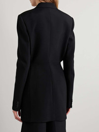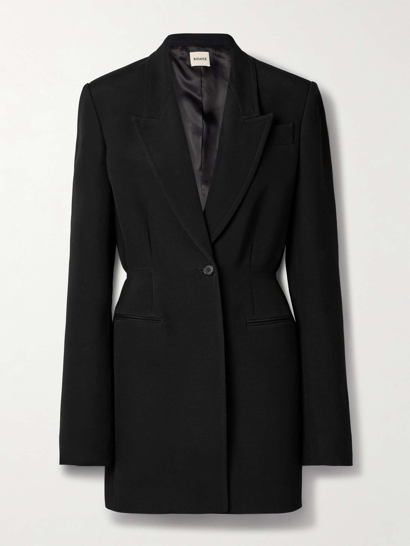 EDITORS'NOTES KHAITE's 'Beckett' blazer is woven in a relaxed, longline silhouette tempered by darts at the waist for distinct definition. Tailored in a single-breasted design, it has sharp peak lapels and padded shoulders for structure. The full satin-twill lining ensures a smooth, comfortable fit. SIZE & FIT - Fits true to size, take your normal size - Tailored to be slightly fitted at the bust and waist, loose at the hip - Internal shoulder pads - Mid-weight, non-stretchy fabric - Model is 180cm/ 5'11" and is wearing a US 2 DETAILS & CARE - Black viscose and polyamide-blend - Button fastening at front - 75% viscose, 25% polyamide; buttons: 100% horn (Buffalo)