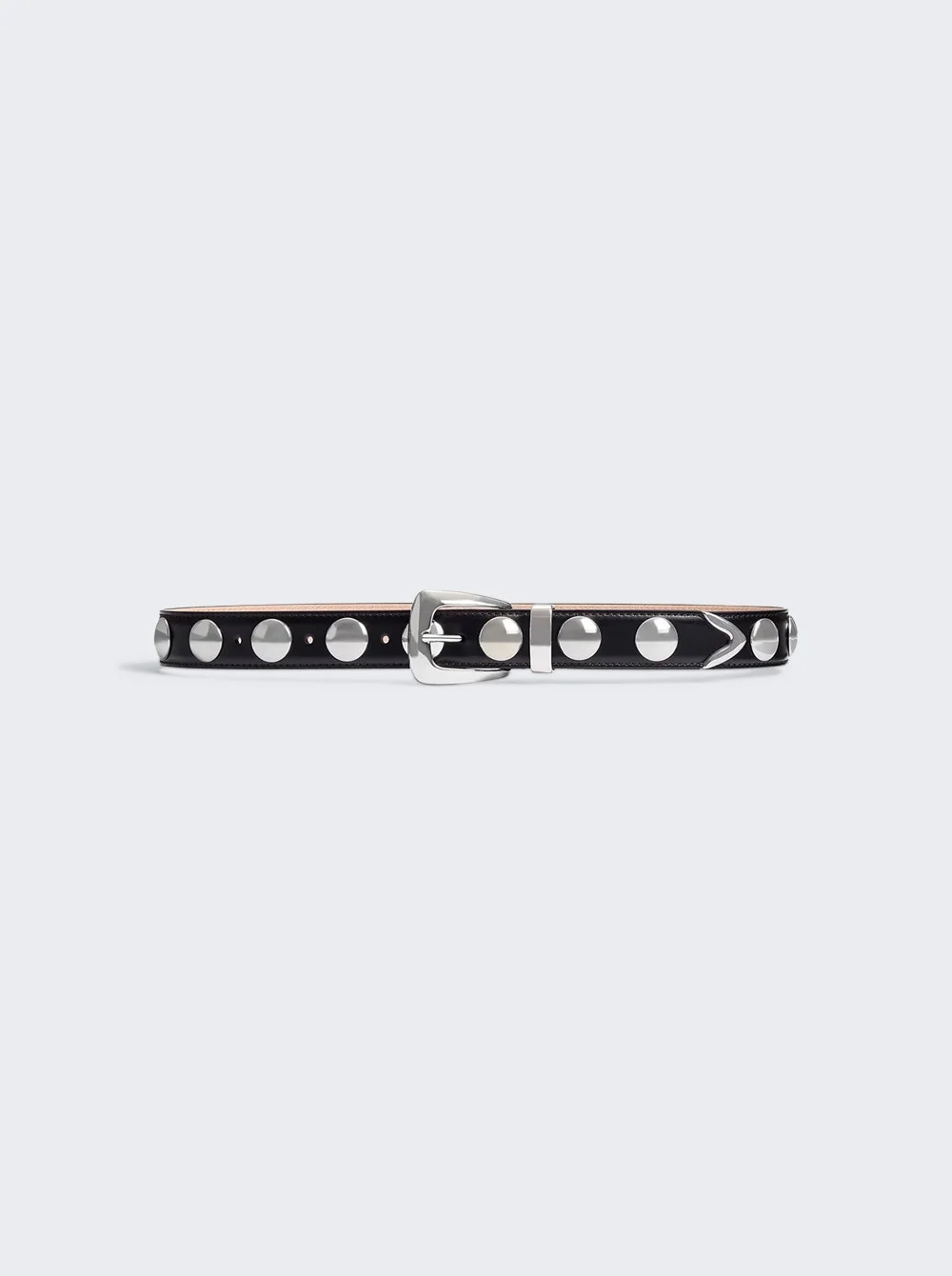 Details - Calfskin leather belt with tonal topstitching - Polished silver-toned studded discs - Brushed silver buckle, loop, and tip - Size: 30mm / 1.2in - Material: 100% Calfskin Leather Vendor Color Code: Brand Style: 10014-763 Designer/Brand: KHAITE