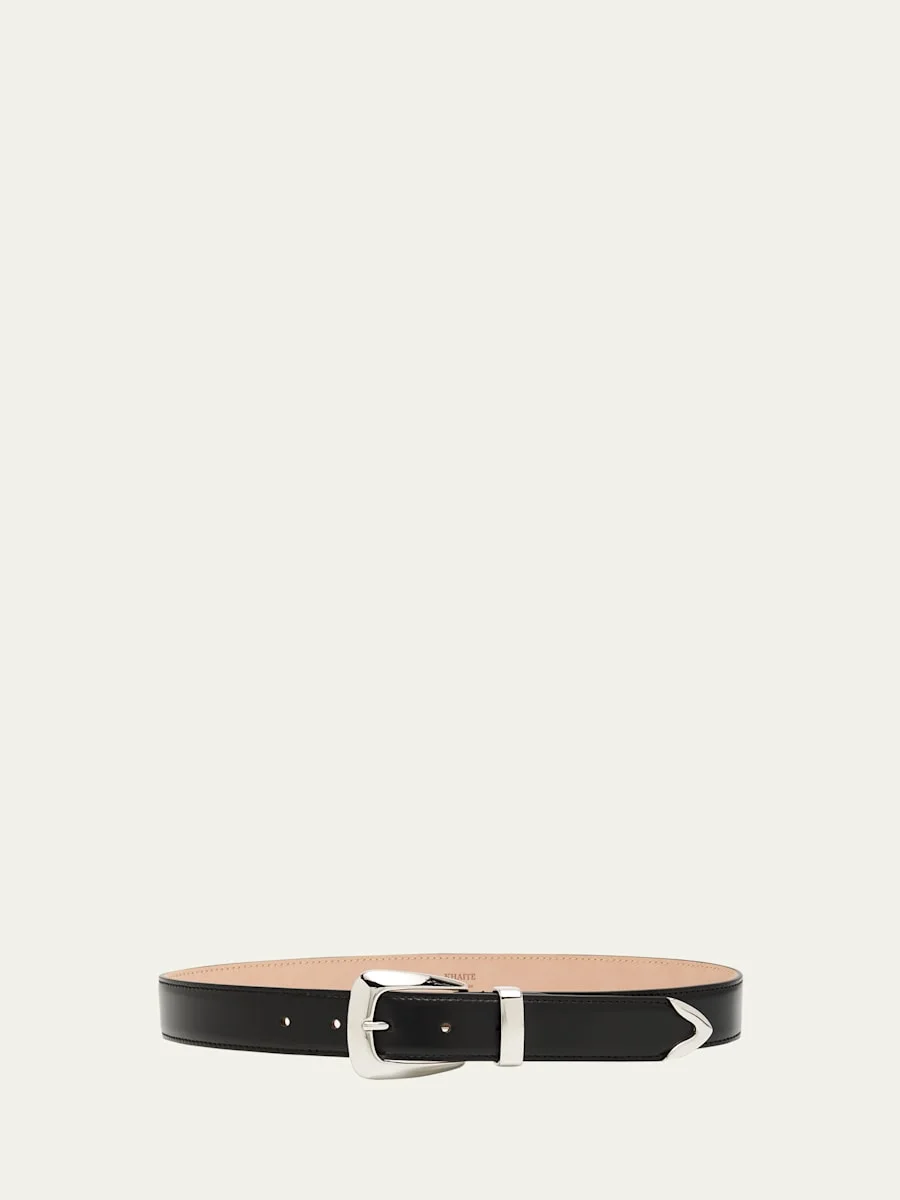 Khaite "Benny" calfskin leather belt with silvertone buckle and end cap Medium width Adjustable fit Leather Made in Italy Online Inquiries: BGS21_D53AU| Store Inquiries: #4930189