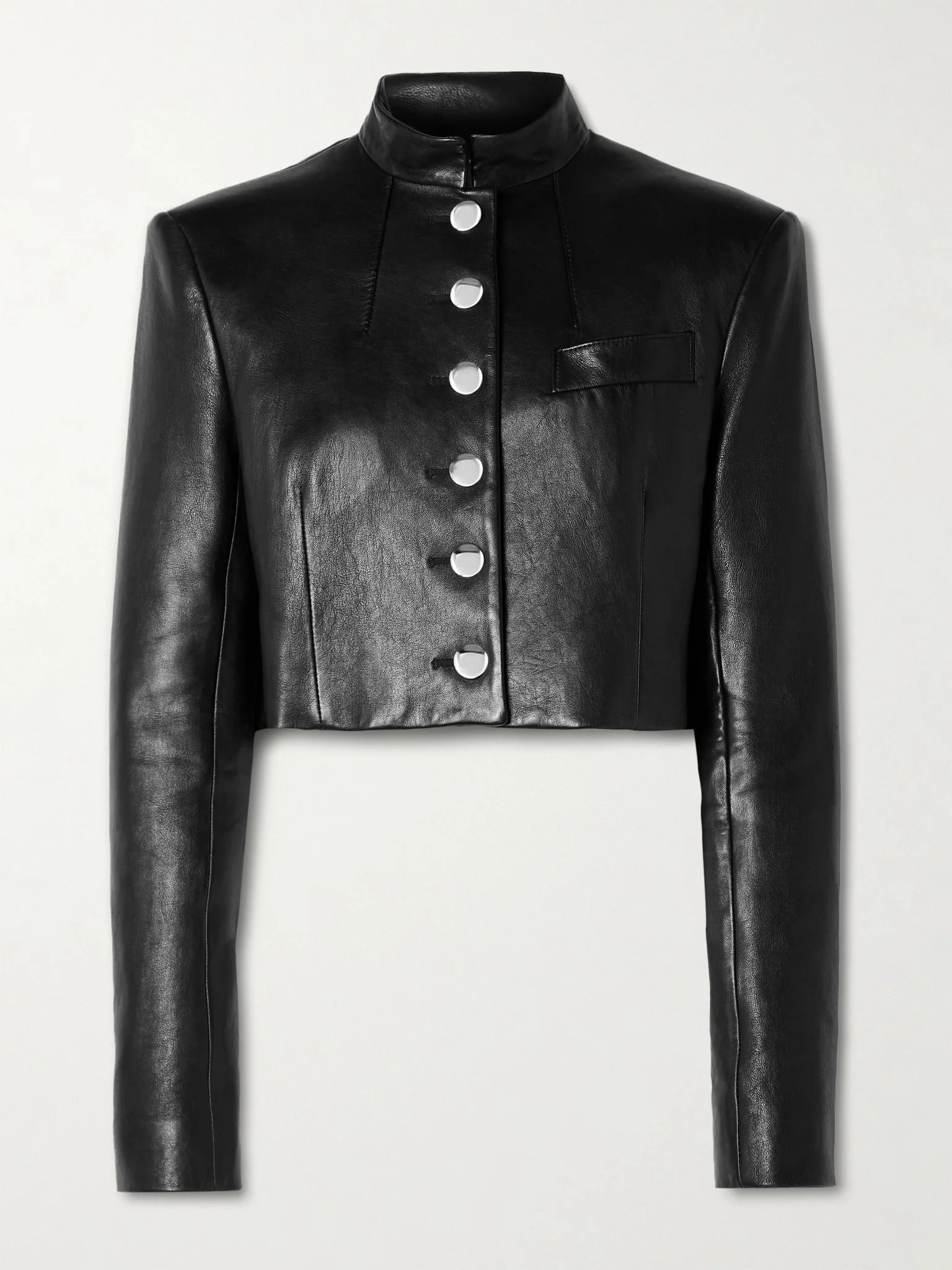 KHAITE's 'Samuelson' jacket is reminiscent of military styles, thanks to the high neckline and polished silver-tone buttons. Made from black leather, it has a boxy, cropped shape and angular padded shoulders for structure. Size & Fit - Fits true to size, take your normal size - Designed for a slim fit - Cropped length - Firm, non-stretchy leather - Model is 180cm/ 5'11" and is wearing a US 4 Model measurements: - Bust: 79cm/ 31" - Waist: 61cm/ 24" - Hip: 89cm/ 35" Details & Care - Black leather - Button fastenings through front - 100% leather (Lamb)