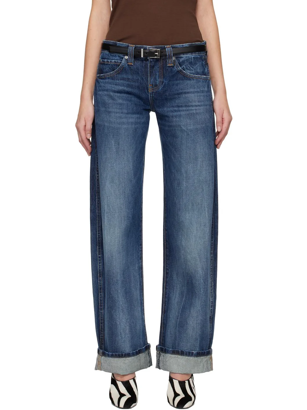 Hand-finished non-stretch denim jeans. · Fading and whiskering throughout · Low-rise · Belt loops · Five-pocket styling · Zip fly · Curved outseams · Contrast stitching in tan Supplier color: Lykens 100% cotton. Made in United States 261914F069002