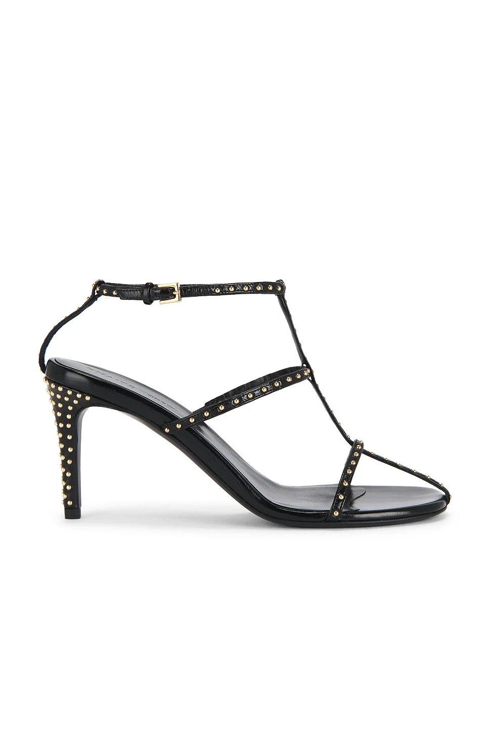 Details - Black glossed-leather - Made in Italy - Buckle-fastening ankle strap - Padded leather footbed - Almond toe - Gold stud detailing throughout - Stiletto heel - Approx 75mm/ 3 inch heel - Our Style No. KTAH-WZ263 - Manufacturer Style No. F2045-943