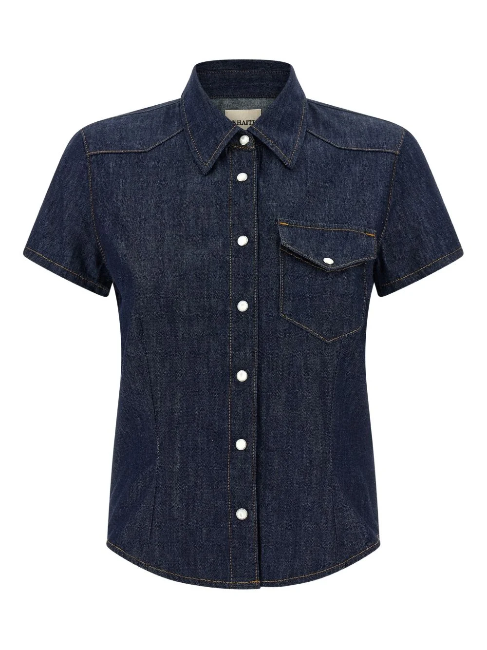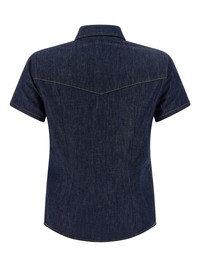 snap button cotton denim shirt Highlights - Blue - Front flap pocket - Polo collar - Short sleeves - Snap button closure - Yoke at the back Made in United States Composition Cotton 100% Washing instructions Read Manufacturer Guidelines