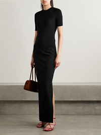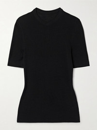 KHAITE's 'Celina' top will work with so many outfits, but if you're going for a monochromatic look we suggest pairing it with the matching skirt. It's been made in Italy from ribbed wool-blend and has a close fit and elongated short sleeves. Size & Fit - Fits true to size, take your normal size - Designed for a close fit - Lightweight knit - Model is 180cm/ 5'11" and is wearing a size Small Model measurements: - Bust: 79cm/ 31" - Waist: 61cm/ 24" - Hip: 89cm/ 35" Details & Care - Black wool-blend - Slips on - 96% wool, 3% polyamide, 1% polyurethane