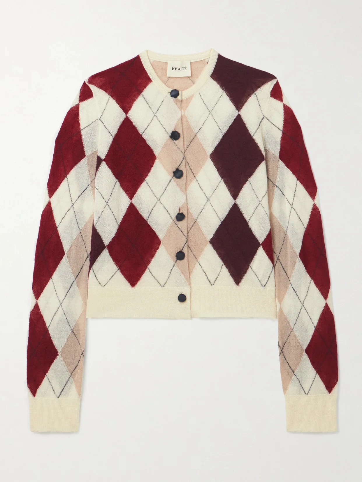 KHAITE's Fall '25 collection is largely inspired by the works of late American filmmaker David Lynch. This 'Charli' cardigan is made from cashmere and mohair-blend and jacquard-knitted with preppy argyle checks. The fuzzy calf hair buttons add a cool, tactile finish.