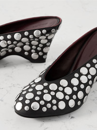 KHAITE's 'Cloak' mules are covered in silver-tone studs that create such a cool feel. They're crafted from soft leather and have low-cut vamps and sculptural 75mm heels. Size & Fit - Fits true to size, take your normal size - Italian sizing Details & Care - Heel measures approximately 75mm/ 3 inches - Black leather (Lamb) - Slips on