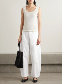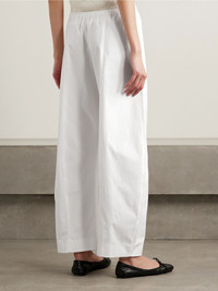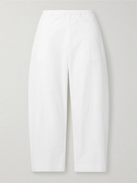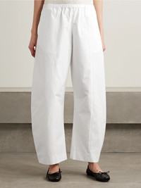 KHAITE's 'Clover' pants have a curved barrel-leg silhouette that tapers toward the ankles. They're cut from cotton-poplin and topped with an elasticated waistband. Wear yours with everything from sweaters to T-shirts. Size & Fit - Fits true to size, take your normal size - Mid-rise, cut for a relaxed fit, tapered at the hem - Elasticated at the waist for a flexible fit - Lightweight, non-stretchy fabric - Model is 180cm/ 5'11" and is wearing a size Small Model measurements: - Bust: 79cm/ 31" - Waist: 61cm/ 24" - Hip: 89cm/ 35" Details & Care - White cotton-poplin - Pull on - 100% cotton