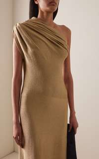 The Khaite girl is ever-evolving—she’s cool but not cold, edgy but effortlessly elegant, and always thinking just ahead of the curve. This Resort collection marries unexpected elements with the gorgeously constructed essentials the New York City brand is known for. Made from a shiny metallic knit, the 'Coast' dress has an asymmetric silhouette that gathers to one shoulder. PRODUCT DETAILS - Resort '26 - Zip fastening - Composition: 33% viscose, 33% elastane, 24% lurex - Dry clean - Made in the USA SIZE & FIT - Our model is wearing a size Small - Model is 5'11.5" with a 31" bust, 23.5" waist, and 34" hip