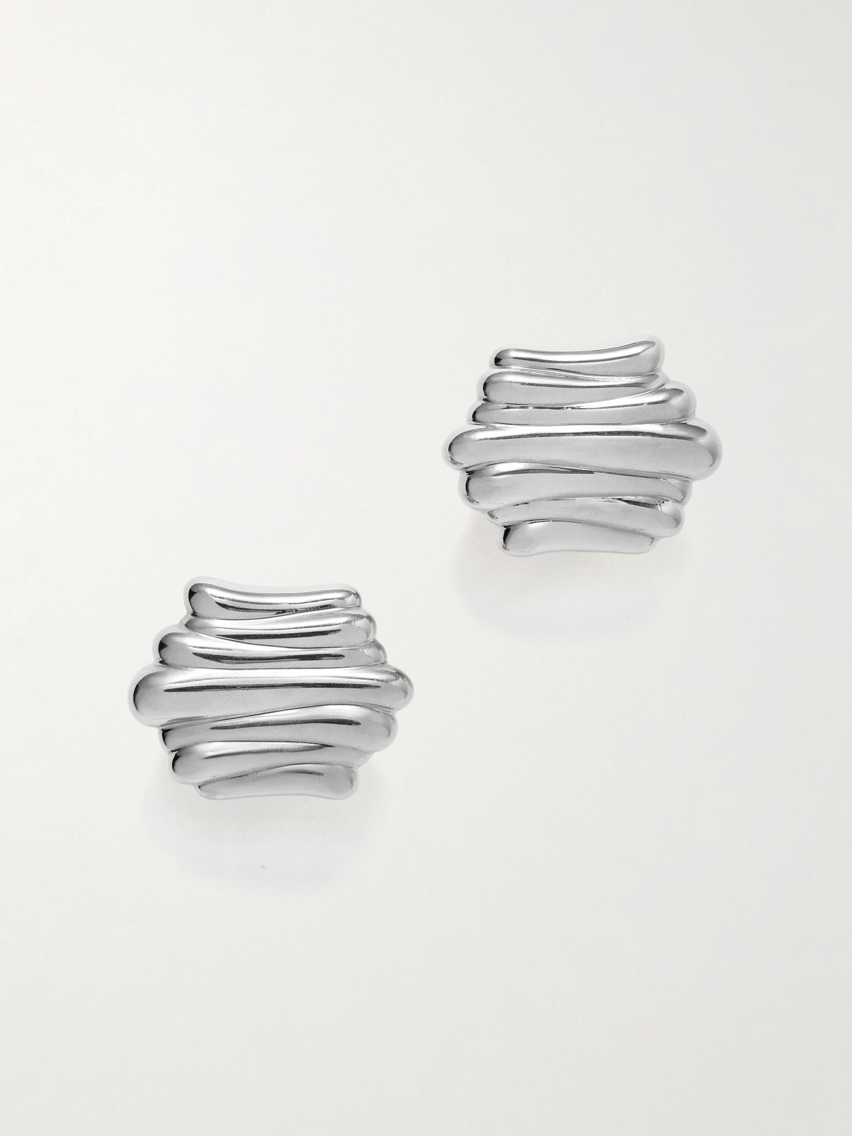KHAITE's Spring '25 collection focuses on unique textures that aren't reserved just for clothing. Part of the lineup, these silver-plated 'Crema' earrings have an exaggerated shape and curved, rippled finish.