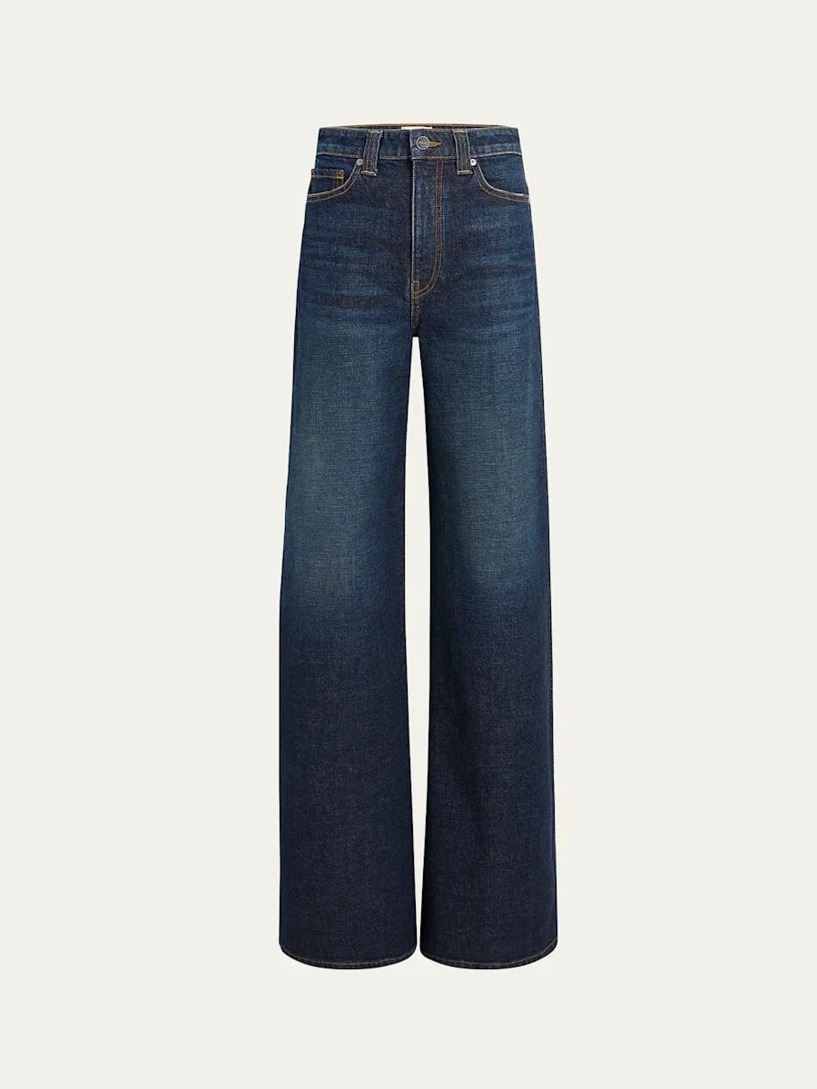 Khaite "Dane" jeans in dark wash denim with slight fading and contrast stitching High rise Fivepocket style Wide legs Full length Button/zip fly; belt loops Cotton/polyurethane Dry clean Made in USA