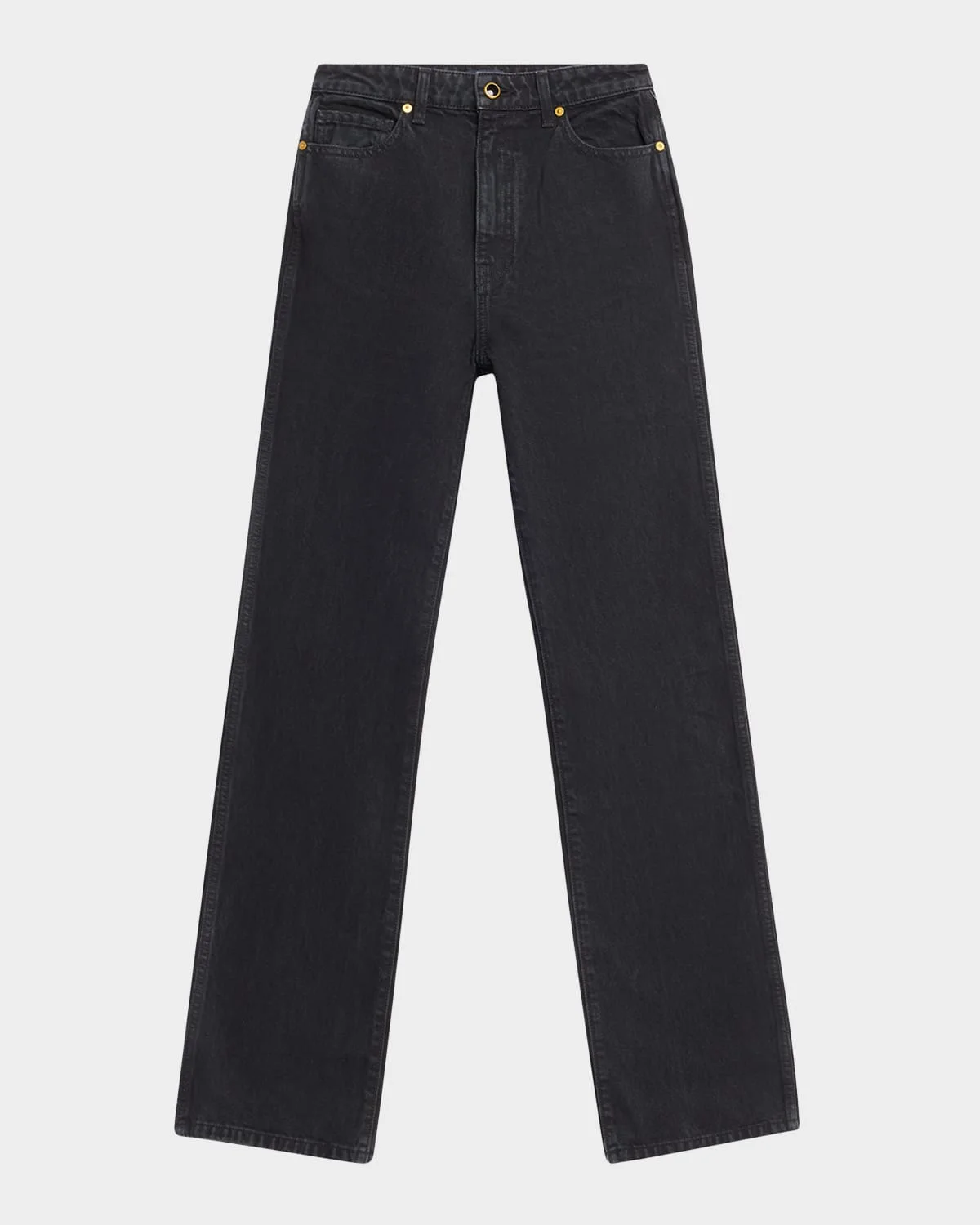 Khaite "Danielle" jeans with an enameled button of antique brass High rise Long length Stovepipe silhouette Fivepocket style Button/zip fly; belt loops Cotton Made in USA