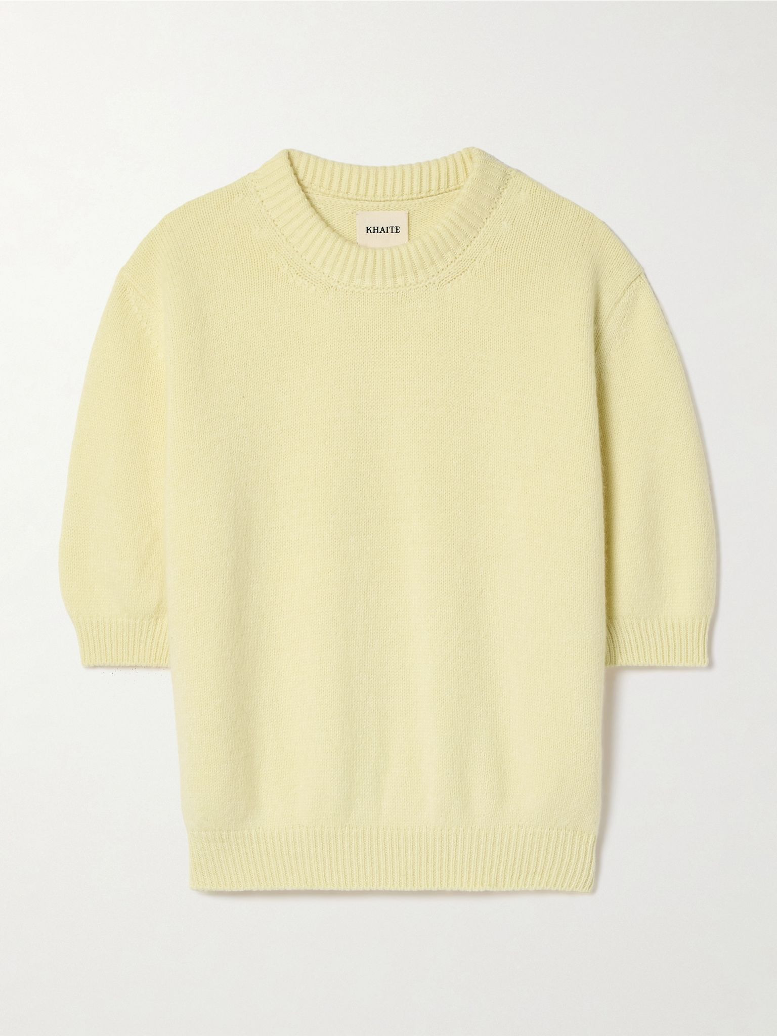 KHAITE's understated 'Davin' sweater will be the foundation of countless outfits - if you're a fan but prefer other shades, we carry it in gray, mushroom and black, too. It's knitted from soft, plush cashmere and has subtly puffed elbow-length sleeves and ribbed trims. Style it with everything from jeans to a midi skirt or tailored pants. Details & Care - Pastel-yellow cashmere - Slips on - 100% cashmere - Designer color: Zest