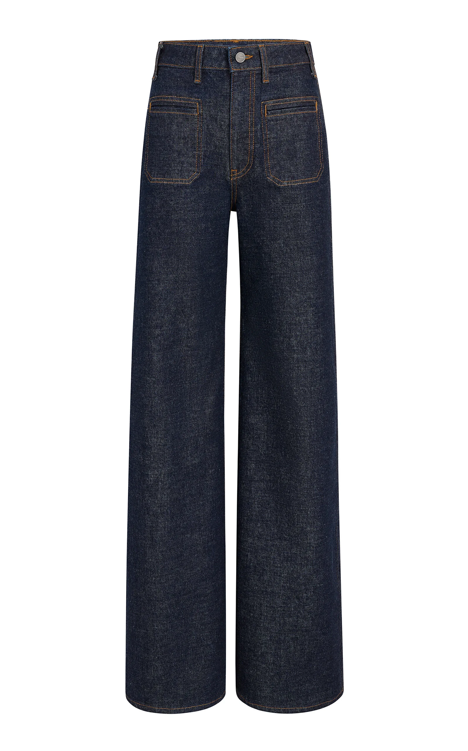 For Spring '26, Cate Holstein delivers pure New York City energy in a multitude of expressions that coalesce into a singularly fluid wardrobe. Cut from stretchy dark-wash denim, the 'Delmonico' jean has a high rise and wide legs with 70s-inspired pocketing. PRODUCT DETAILS - Spring '26 - Button and concealed zip fastening - Composition: 98% Cotton, 2% Polyurethane - Designer color: Benson - Machine wash - Made in the USA SIZE & FIT - Our model is wearing a size 26 - Our model is 5'11" with a 30" bust, 24" waist, and 34" hip