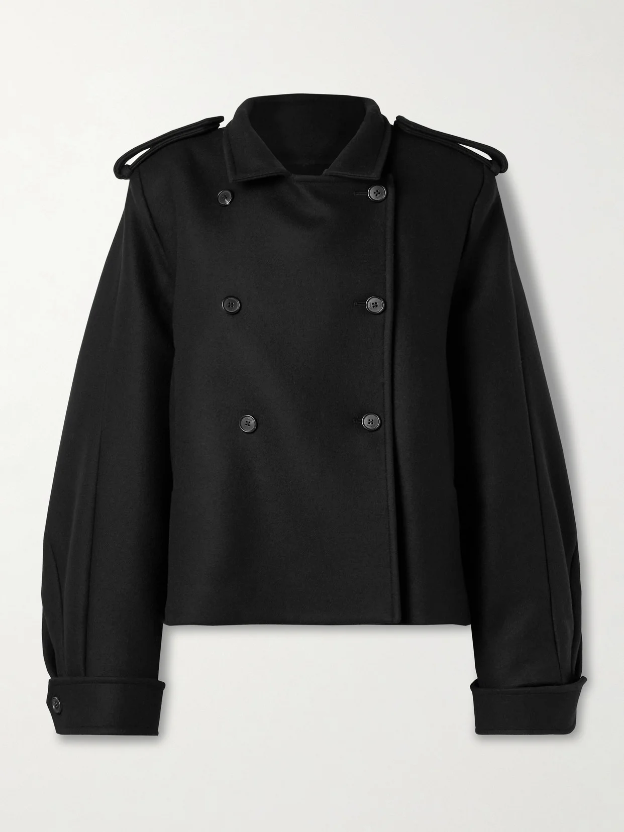 KHAITE's double-breasted 'Dean' jacket borrows design elements from classic military styles. Made from insulating wool, it features slightly long, voluminous sleeves, a wide strap across the back and shoulder pads to accentuate the epaulettes.