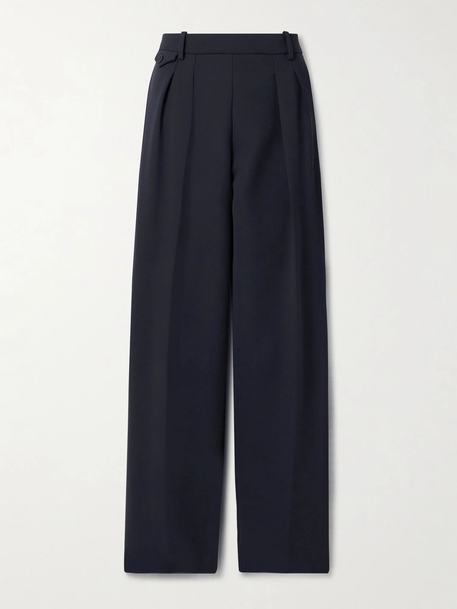 KHAITE's 'Dugan' pants made their first appearance on the Fall '25 runway. Tailored from crepe, they have a mid rise and tapered legs defined by neat pleats. Wear yours with a crisp shirt and loafers. Size & Fit - Fits true to size, take your normal size - Mid-rise, cut for a relaxed fit, tapered at the hem - Mid-weight, non-stretchy fabric - Model is 180cm/ 5'11" and is wearing a US 2 Model measurements: - Bust: 81cm/ 32" - Waist: 64cm/ 25" - Hip: 93cm/ 36.5" Details & Care - Navy crepe - Concealed zip fastening along side - 100% polyester - Dry clean