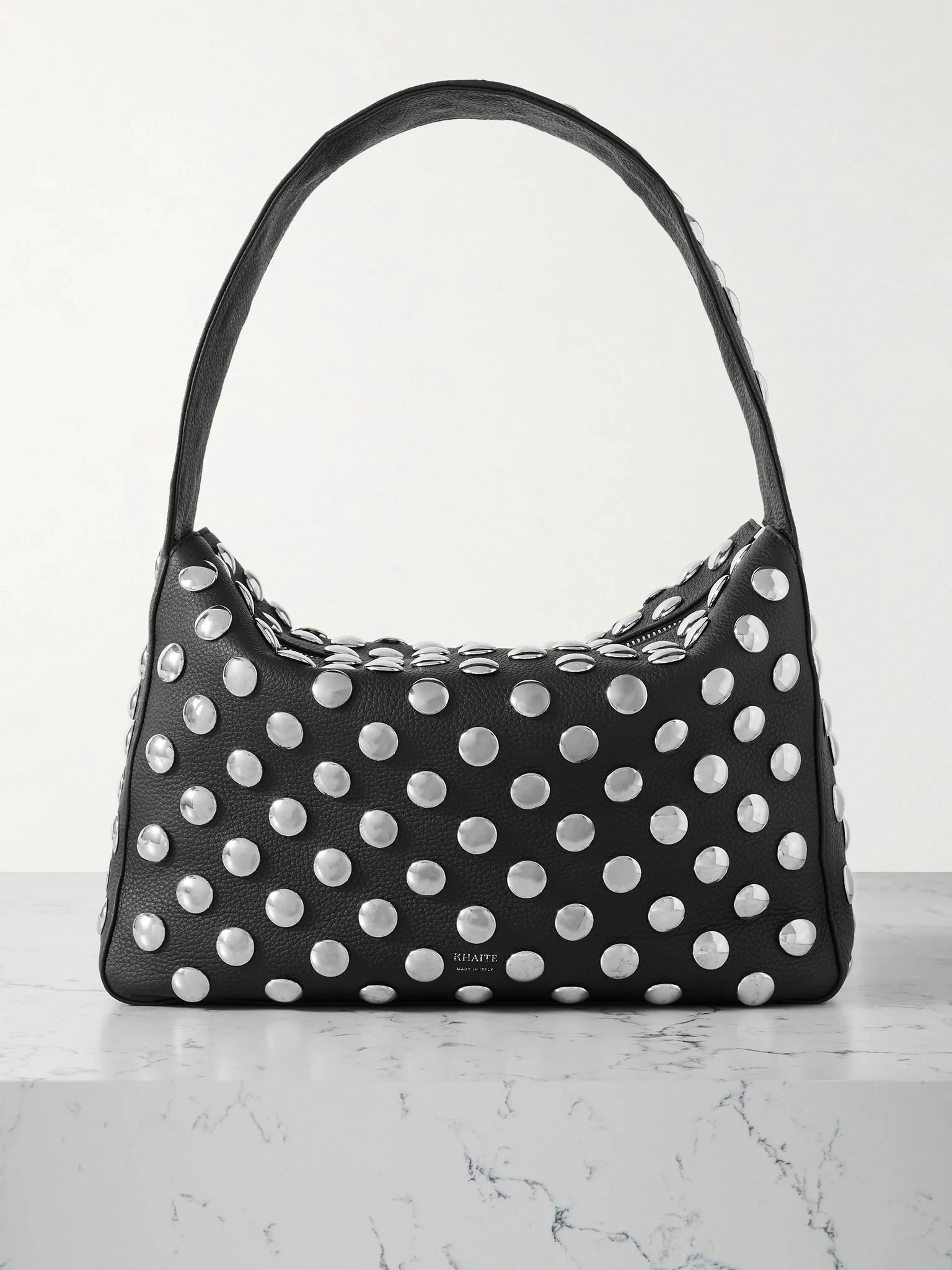 Khaite's 'Elena' bag reminds us of classic '90s styles, updated with a bit more space inside. Made from textured-leather and embellished with silver-tone studs, it's sized to fit your phone, keys and sunglasses case and has a compartment for your most-used cards. The wide strap rests comfortably on your shoulder. Details & Care - Black textured-leather (Calf) - Top handle - Internal slip pocket - Fully lined - Zip fastening along top