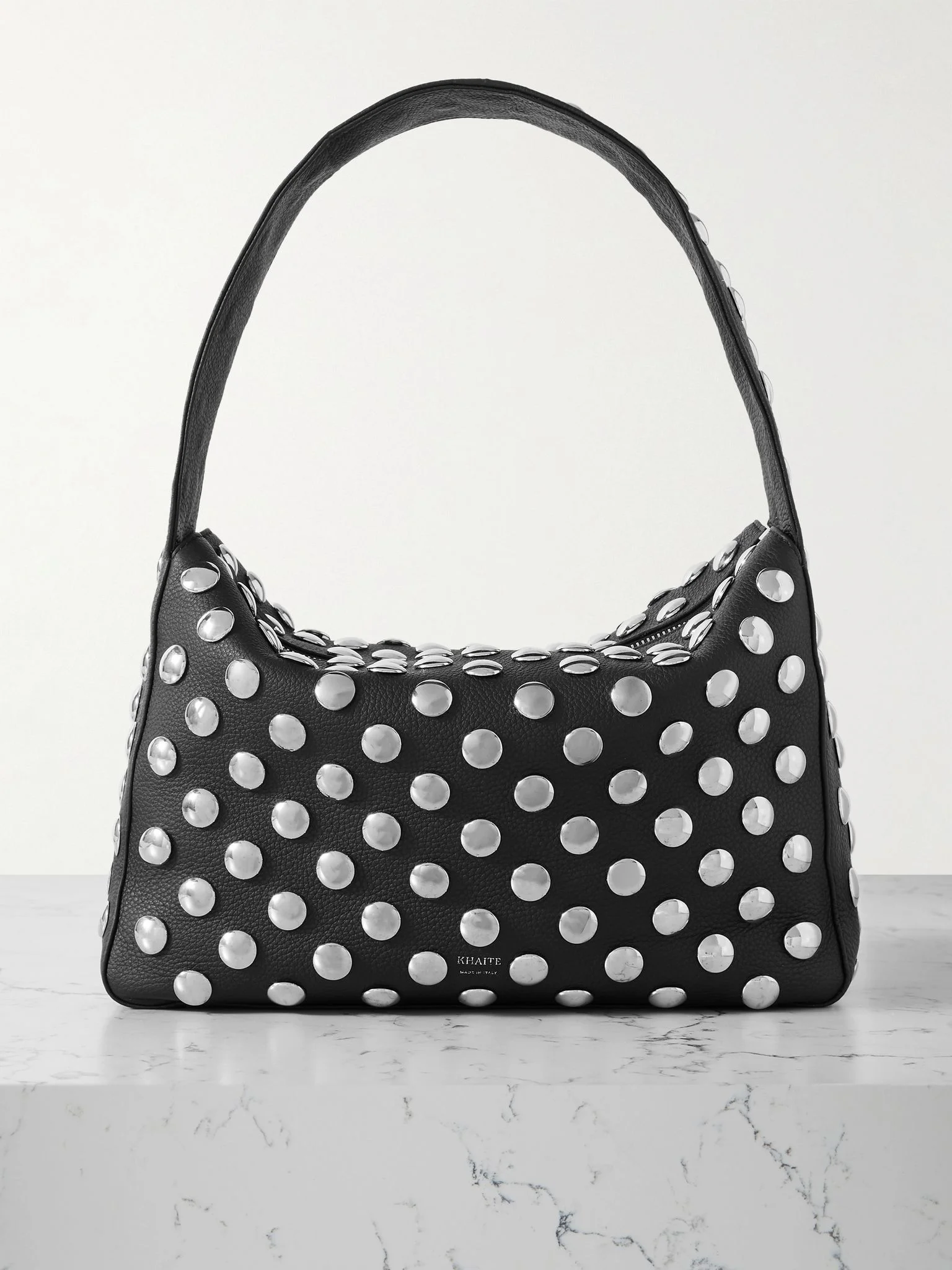Khaite's 'Elena' bag reminds us of classic '90s styles, updated with a bit more space inside. Made from textured-leather and embellished with silver-tone studs, it's sized to fit your phone, keys and sunglasses case and has a compartment for your most-used cards. The wide strap rests comfortably on your shoulder. Details & Care - Black textured-leather (Calf) - Zip fastening along top