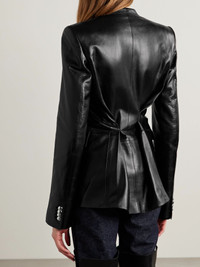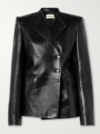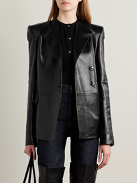 There were so many striking leather pieces on KHAITE's Fall '25 runway, this 'Elona' jacket being one of them. It's tailored for a slim fit ad has strongly padded shoulders and polished silver-tone buttons. The full lining allows for smooth layering. Size & Fit - Fits true to size, take your normal size - Designed for a slim fit - Internal shoulder pads - Supple, non-stretchy leather - Model is 180cm/ 5'11" and is wearing a US 4 Details & Care - Black leather - Button fastenings through front - 100% leather (Lamb) - Fully lined - Specialist clean