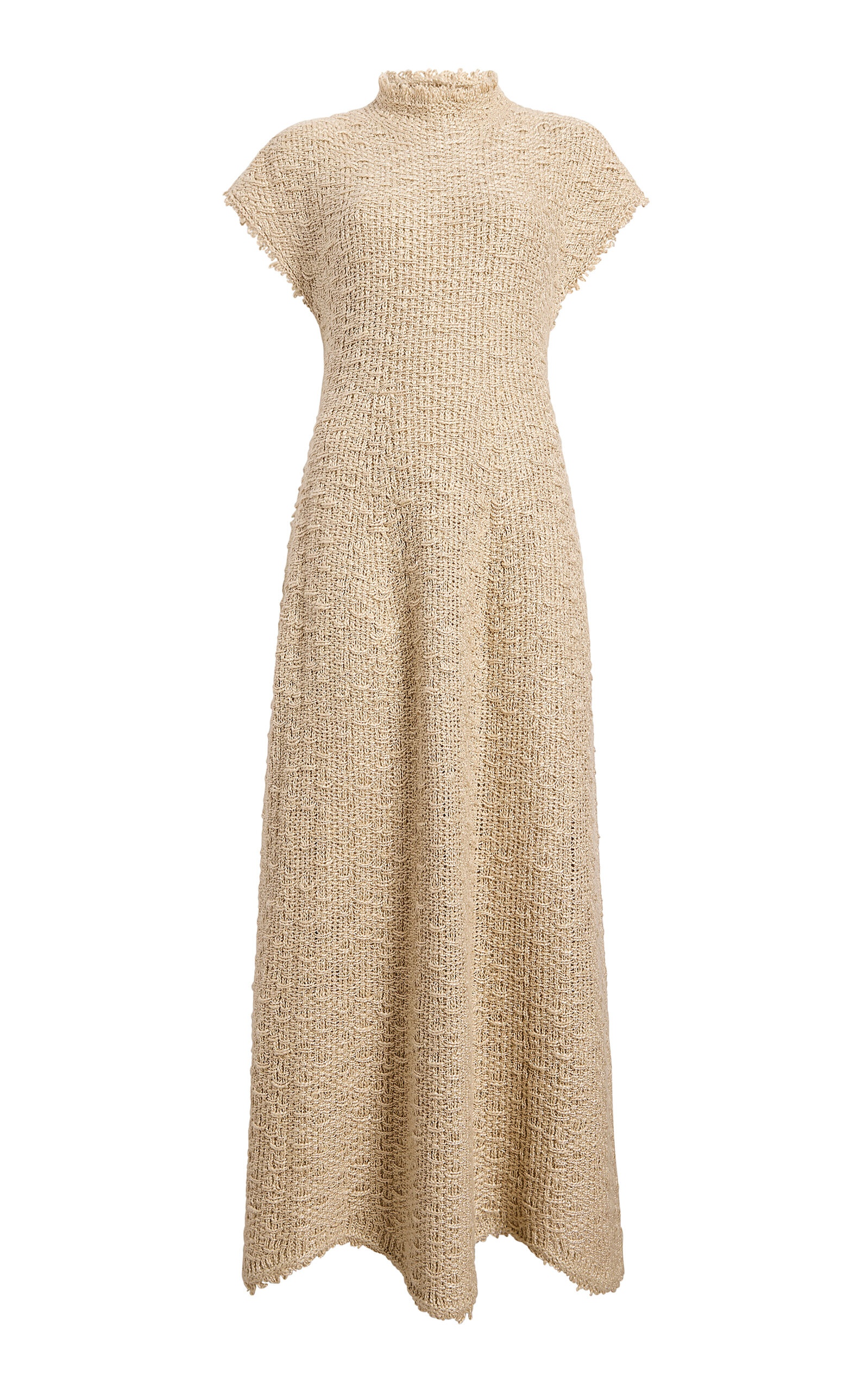 PRODUCT DETAILS - Short sleeves, mock neck, A-line, maxi hem - Slip on - Unlined - Composition: 54% Hemp, 46% Silk - Color: Flax - Dry clean only - Spring/Summer '25