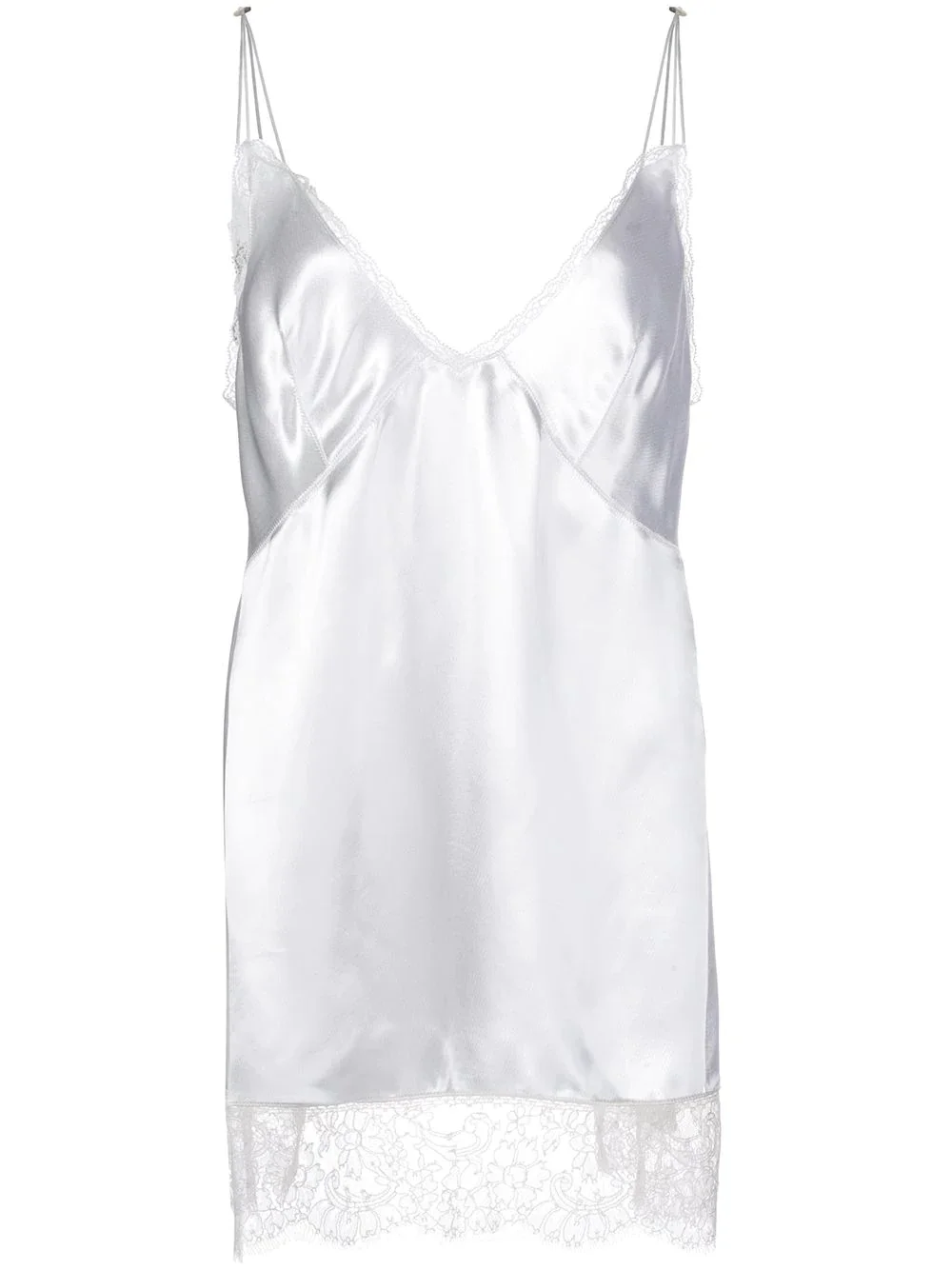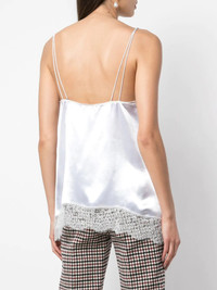 Emi lace-hem top White Emi lace-hem top from Khaite featuring lace inserts, a scalloped lace hem, a plunging neck and spaghetti straps. Imported Composition Viscose 100% SIZE & FIT Model measurements Height 5 ft 10 in(1.78 m) Bust/Chest 31.88 in(81 cm) Hips 33.85 in(86 cm) Waist 24.01 in(61 cm) Washing instructions Dry Clean Only