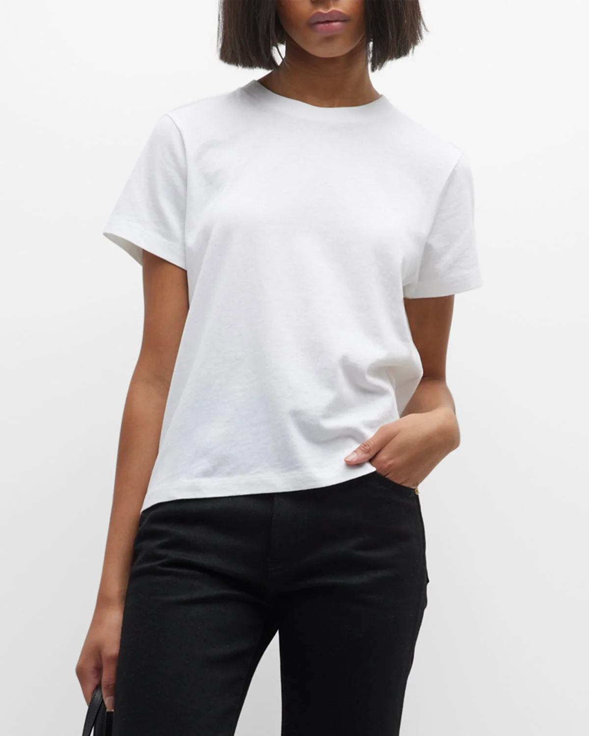 Khaite "Emmylou" classic tee with a logo patch at back & nbsp; Crew neckline Short sleeves Pullover style & nbsp; Hip length & nbsp; Cotton Made in Portugal Model is 5 & apos;10"/177cm.