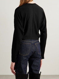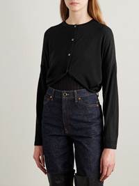 KHAITE's 'Finn' cardigan is gently gathered and cinched at the cropped waist for definition. It's made from semi-sheer merino wool and has a relaxed fit with dropped shoulder seams and horn buttons - leave the last one undone to create a curved shape. Size & Fit - Fits true to size, take your normal size - Designed for a relaxed fit - Cropped length - Fine, semi-sheer knit - Model is 180cm/ 5'11" and is wearing a size Small Details & Care - Black merino wool - Button fastenings - 100% merino wool; buttons: 100% horn (Buffalo) - Dry clean