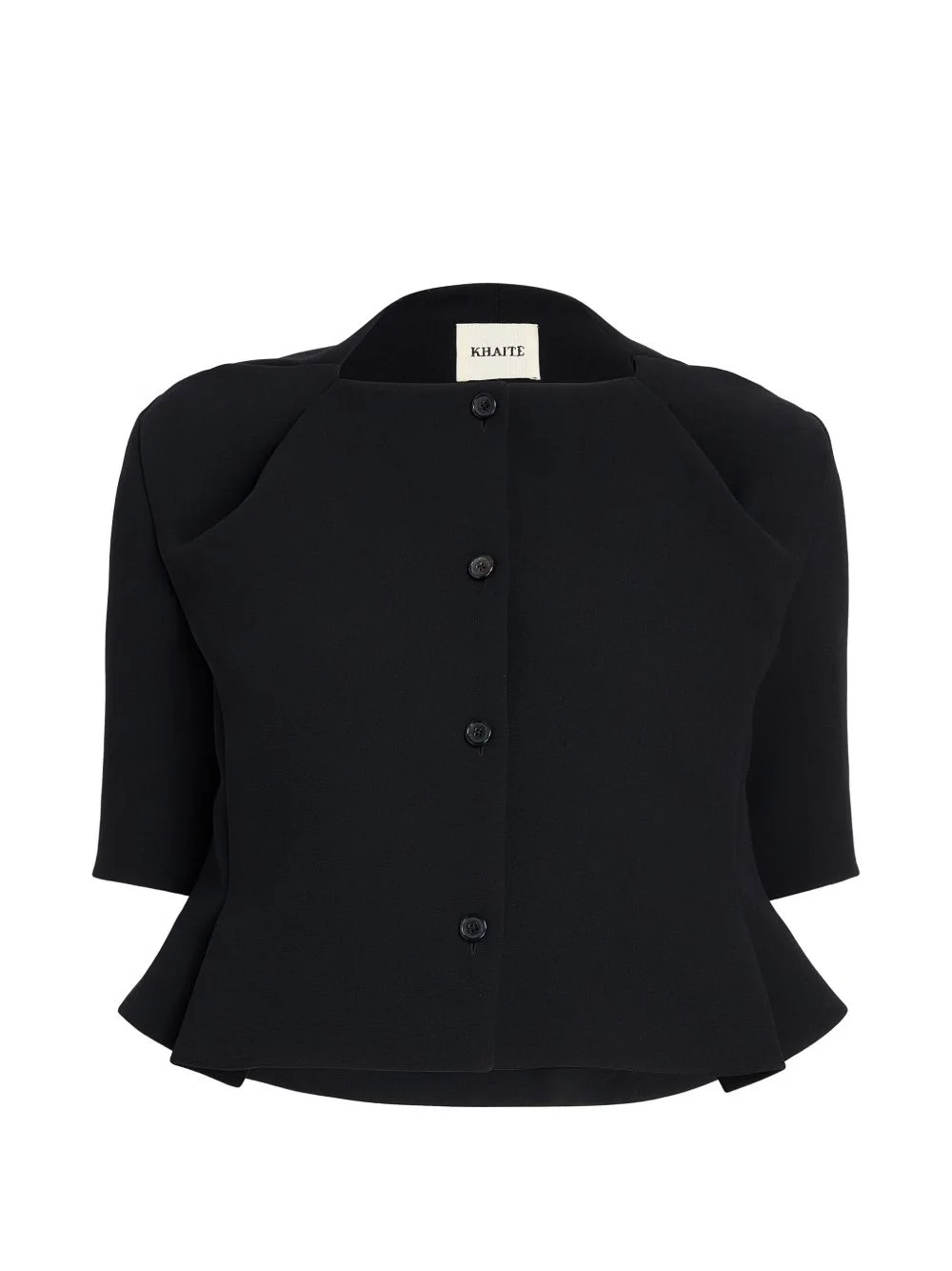 Franc jacket Highlights - A dynamic peplum jacket tailored in bonded italian crepe—a signature fabrication prized for its smooth, seasonless character and architectural structure. the decisively folded neckline frames the face with clean lines that extend to the sleek, elbow-length sleeves. flared and pleated from the waist for a feminine silhouette. lined in soft silk habotai. - Black - Button fastening Made in Italy Composition Polyester 100% Washing instructions Read Manufacturer Guidelines