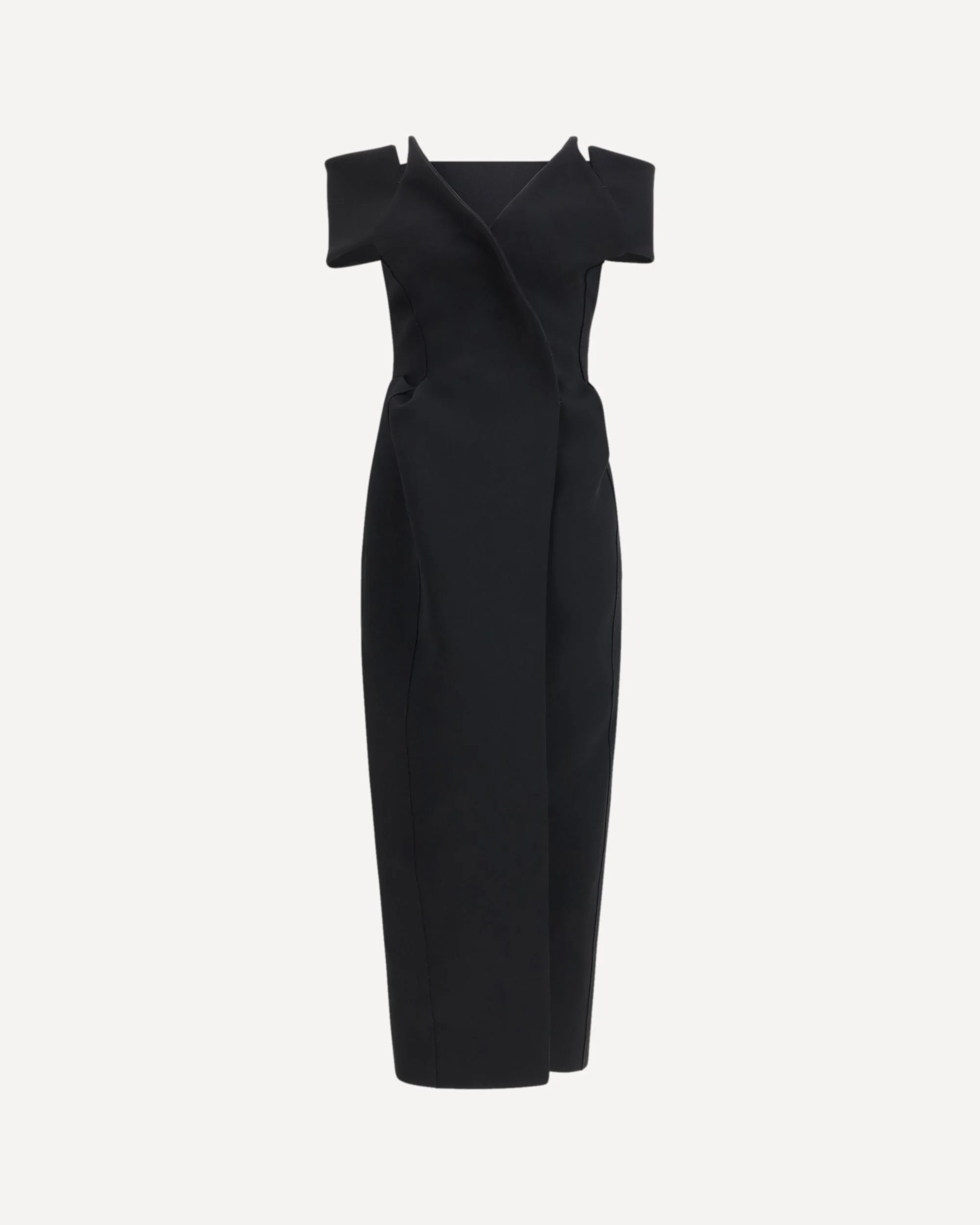 The Gene Dress by Khaite embodies a sleek, sculptural elegance through a refined and modern silhouette. Tailored in double-faced Italian crepe with a matte finish, it features deconstructed lapels and raw-edge seaming that emphasize its asymmetric design. A subtle peplum effect is created through hand tacking at the sides and back, while threaded latch closures and a concealed zipper at the wrapped front complete the piece with understated sophistication. DETAILS - Sku: 55574114_200 - Season: SS26 - Fit: Slim - Composition: GENERAL 100% Polyester - MADE IN U.S.A.