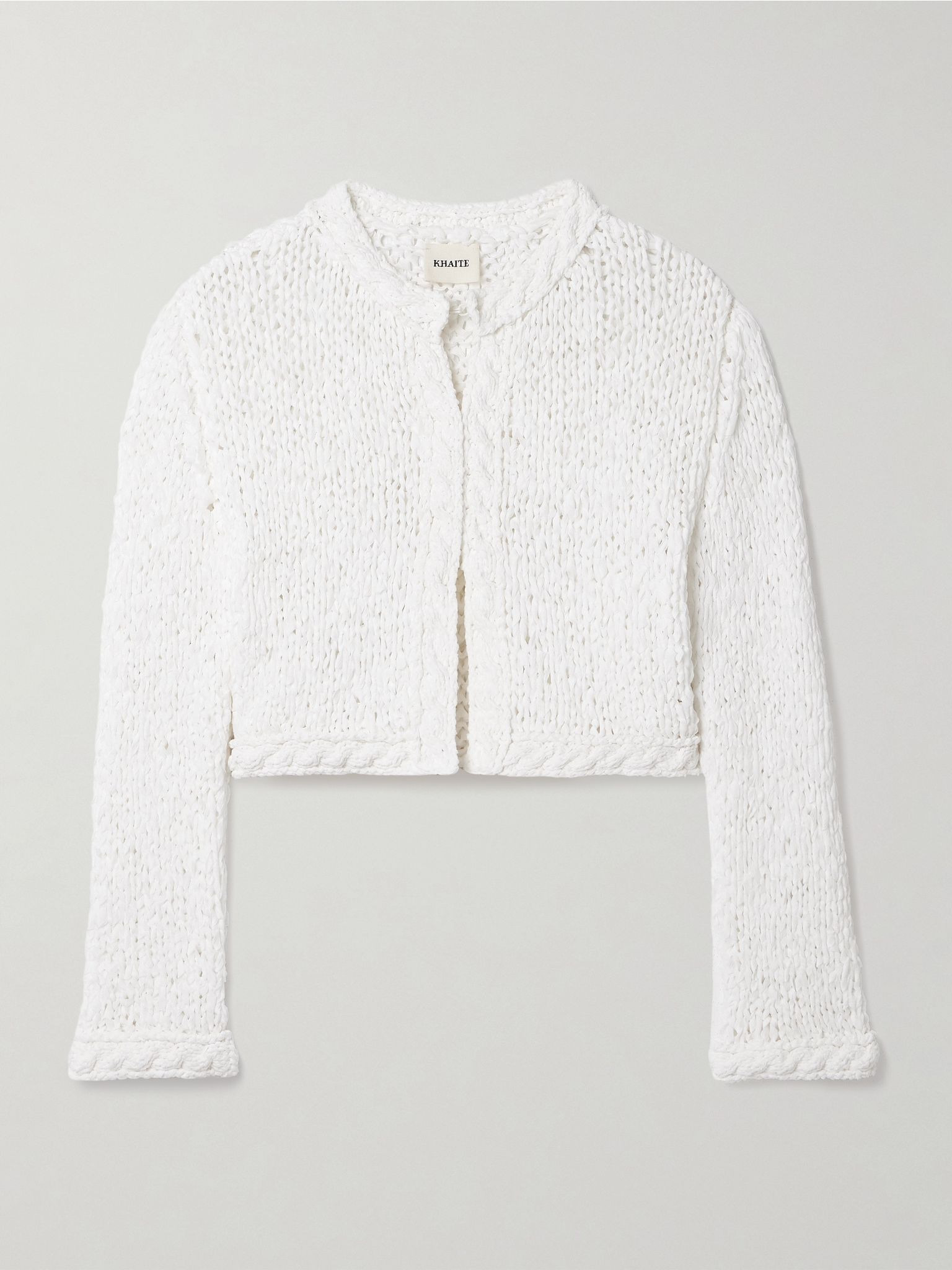 KHAITE's 'Genevieve' cardigan embodies the brand's signature blend of elegance and effortless style. It's handmade from a cotton-blend with an open-knit construction and has a cropped fit. Size & Fit - Fits true to size, take your normal size - Designed for a slightly loose fit - Cropped length - Mid-weight, open knit - Model is 180cm/ 5'11" and is wearing a size Small Model measurements: - Bust: 79cm/ 31" - Waist: 61cm/ 24" - Hip: 89cm/ 35" Details & Care - White cotton-blend - Concealed hook fastenings through front - 71% cotton, 29% nylon - Designer color: Glaze