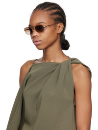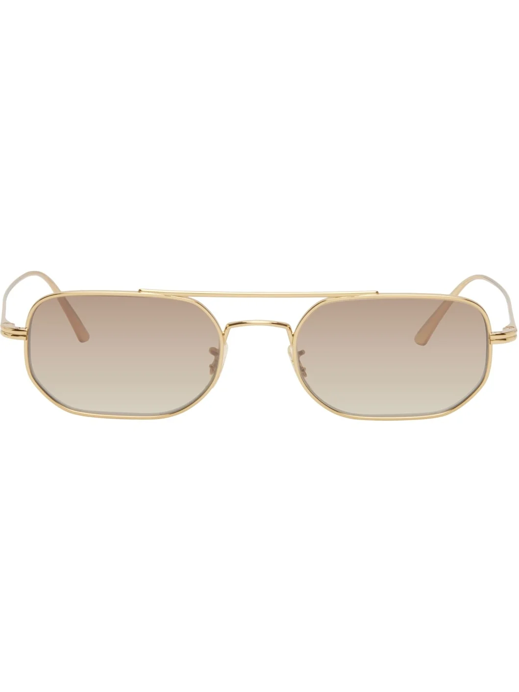 Handcrafted rectangular metal-frame sunglasses in gold tone. · Gradient brown lenses · Top bar · Adjustable rubber nose pads · Logo engraved at temple tips · Includes pouch · Size: 52.19 145 Part of the Khaite x Oliver Peoples collaboration. Supplier color: Gold/Dark brown Metal. Made in Italy 251914F005014