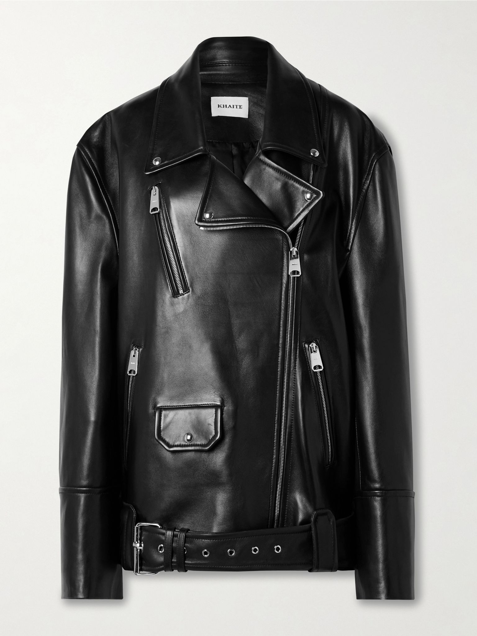 Leave it to KHAITE to make the classic biker jacket feel even cooler. Designed for an oversized fit enhanced by wide sleeves, it's made from supple leather and has silver-tone hardware, including the zips at the cuffs and pockets. You can easily adjust the belt or remove it completely. Details & Care - Black leather - Two-way zip fastening through front - 100% leather (Lamb) - Specialist clean
