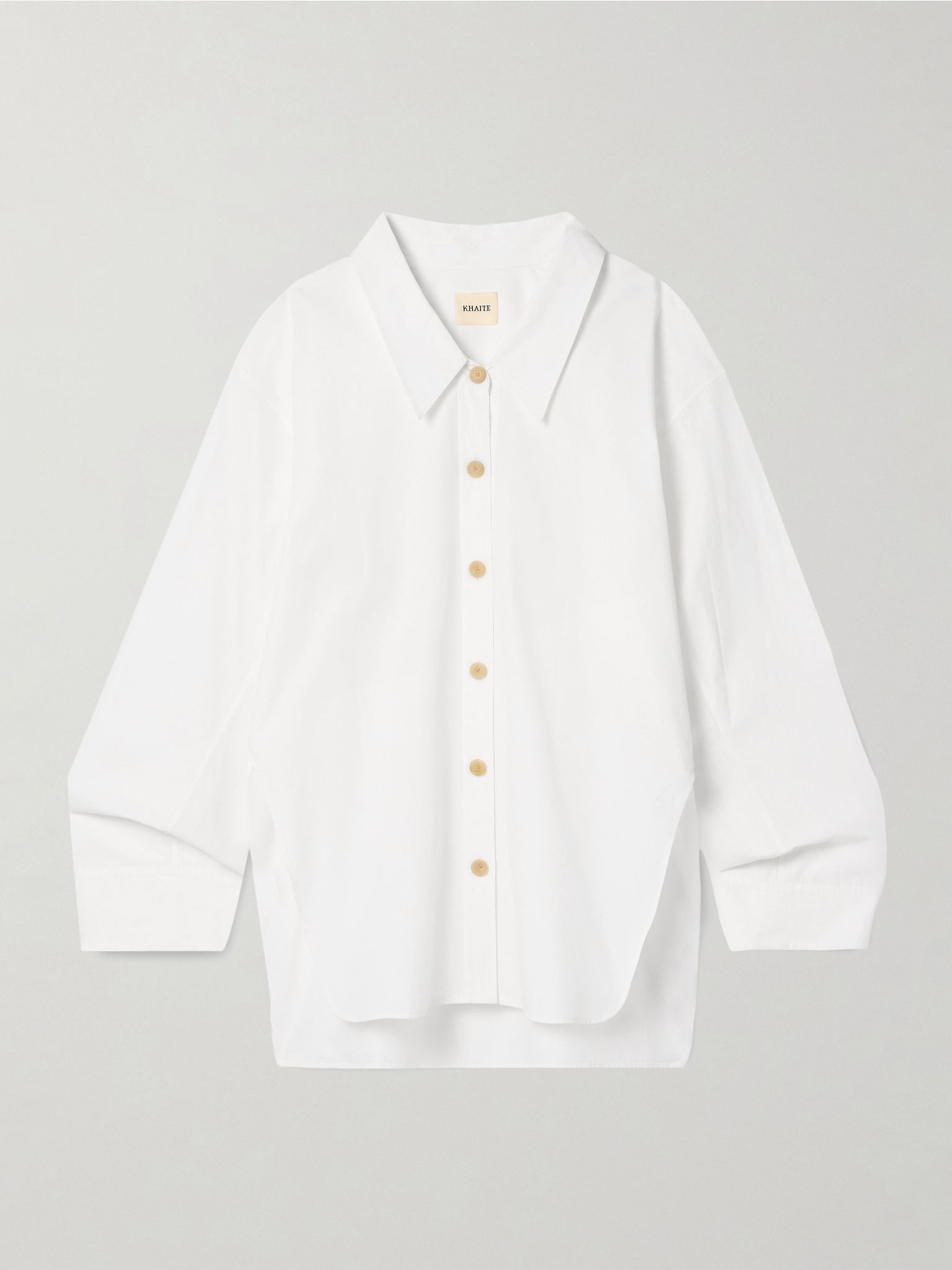 KHAITE’s Spring '25 collection plays with textures and proportions. This 'Herschel' shirt is cut from cotton-poplin and has an oversized fit that's emphasized by dropped shoulders, elongated sleeves and generous side splits. Size & Fit - Intended to be oversized; we recommend sizing down if you prefer a closer fit - Lightweight, non-stretchy fabric - Model is 180cm/ 5’11” and is wearing a size Small Model measurements: - Bust: 79cm/ 31” - Waist: 61cm/ 24” - Hip: 89cm/ 35” Details & Care - White cotton-poplin - Button fastenings through front - 100% cotton; buttons: 100% horn (Buffalo)