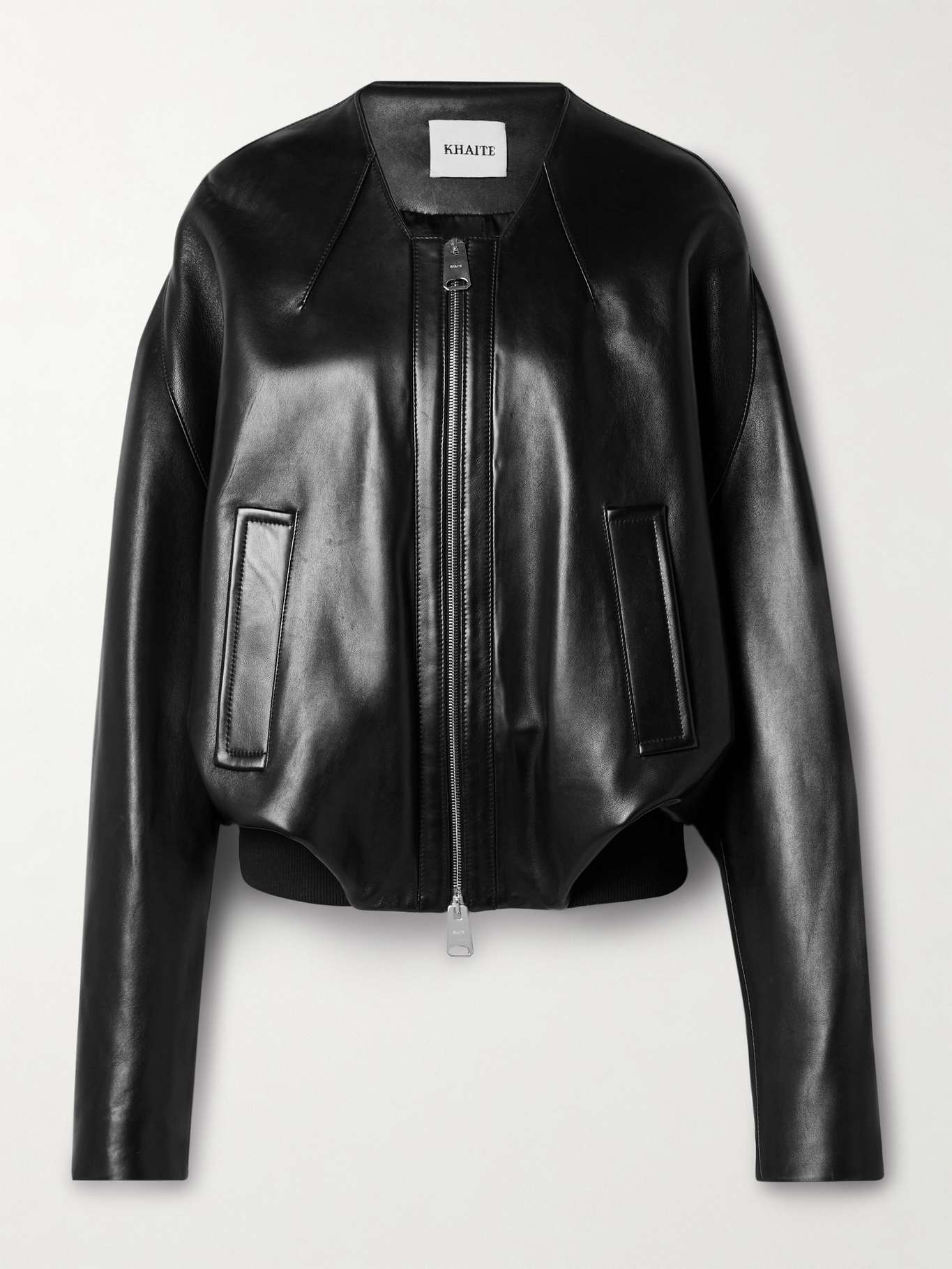 EDITORS'NOTES Sleek, elevated outerwear is a point of focus throughout KHAITE's Spring '25 collection. This 'Hewit' jacket is made from buttery-soft leather in a relaxed, bomber style with elongated sleeves featuring zipped cuffs. The oversized shape and geometric neckline make it more distinct. SIZE & FIT - Intended to be oversized; we recommend sizing down if you prefer a closer fit - Ribbed hem - Supple, non-stretchy leather - Model is 180cm/ 5'11" and is wearing a size Small DETAILS & CARE - Black leather - Two-way zip fastening through front - 100% leather (Lamb)