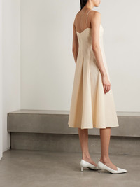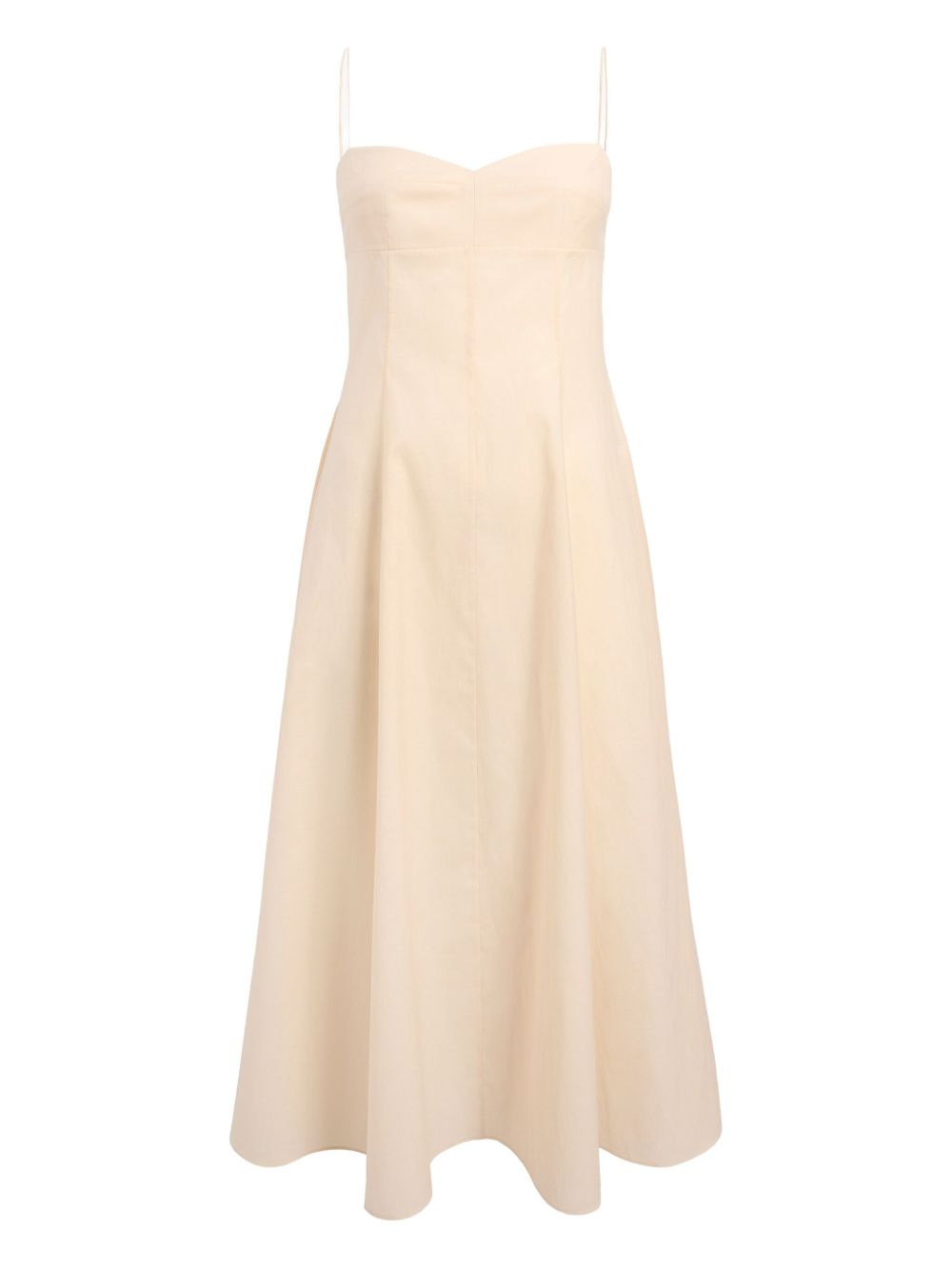 Made from panels of cotton-canvas, KHAITE's 'Isabella' dress is fitted through the bodice and flares to an A-line silhouette. Swap out sandals for pumps to easily transition it from day to night. Size & Fit - Fits true to size, take your normal size - Designed to be fitted at the bust and waist, loose at the hip - Lightweight, semi-sheer, non-stretchy fabric - Model is 180cm/ 5’11” and is wearing a US 2 Model measurements: - Bust: 79cm/ 31” - Waist: 61cm/ 24” - Hip: 89cm/ 35” Details & Care - Beige cotton-canvas - Concealed hook and zip fastening at back - 100% cotton