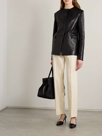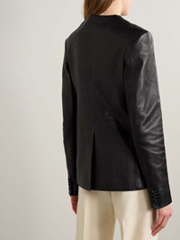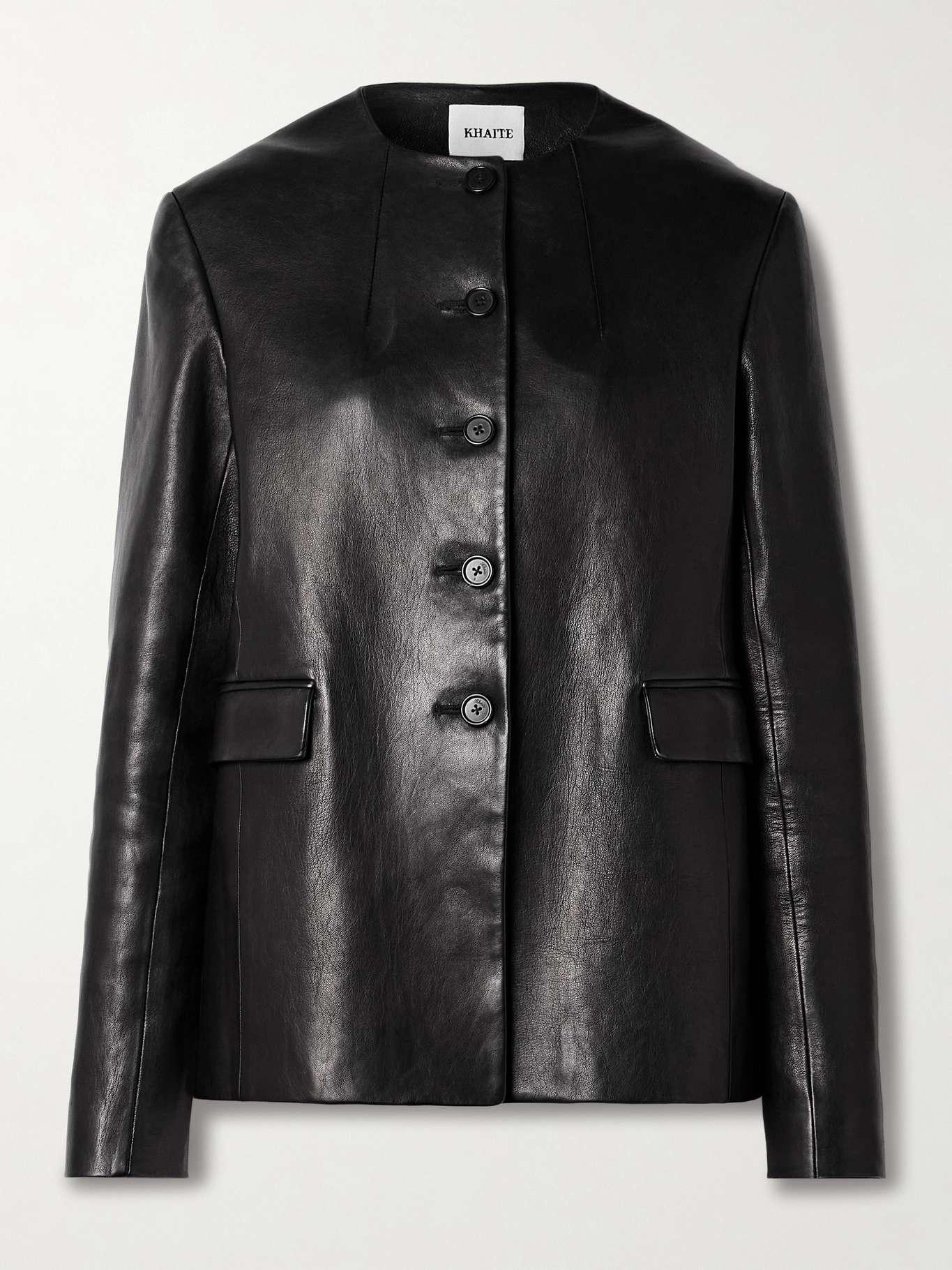 KHAITE's 'Jameson' jacket is sophisticated minimalism at its finest. Made from supple leather, this version has a collarless, loose design with padded shoulders and flap pockets. Style yours with tailoring or jeans. Size & Fit - Fits true to size, take your normal size - Designed for a loose fit - Supple, non-stretchy leather - Model is 180cm/ 5’11” and is wearing a US 2 Details & Care - Black leather - Button fastenings through front - 100% leather (Lamb); buttons: 100% horn (Buffalo) - Specialist clean