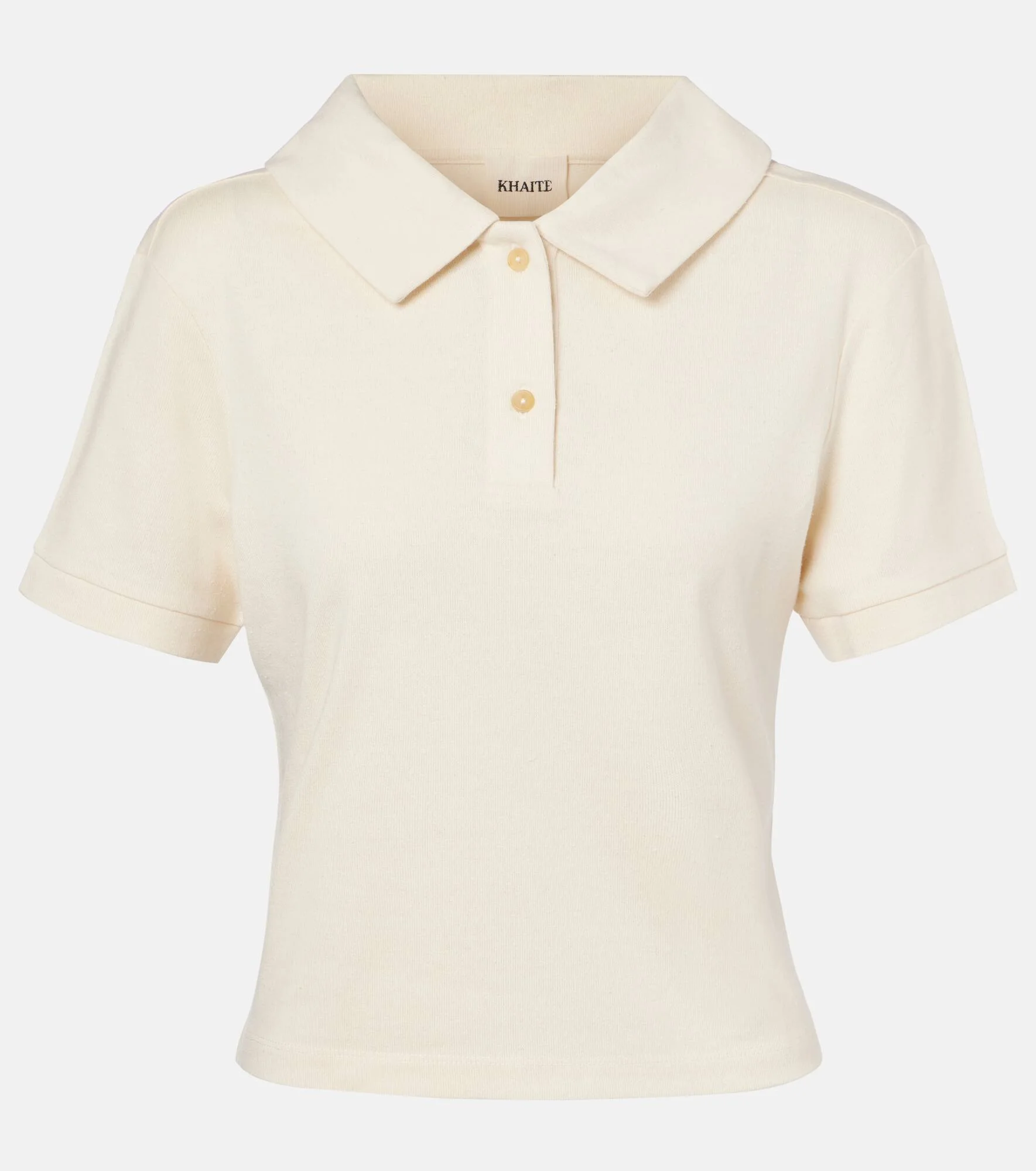 Khaite's minimalist designs exude modern sophistication and effortless elegance. The Jasna polo shirt is crafted from pure silk and features a slightly cropped silhouette with a classic collar and a partially buttoned front. Product Details - Material: 100% silk - Care instructions: dry clean - Made in Portugal - Designer color name: Cream - Item color: white - Collar: polo collar - Closure: partially buttoned front - Sleeves: short-sleeved - Item number: P01107113 Size & Fit - True to size - Straight fit - Slightly stretchy fabric - Falls to the hip - The model seen in the picture is 178cm-5'10" and wearing a size XS