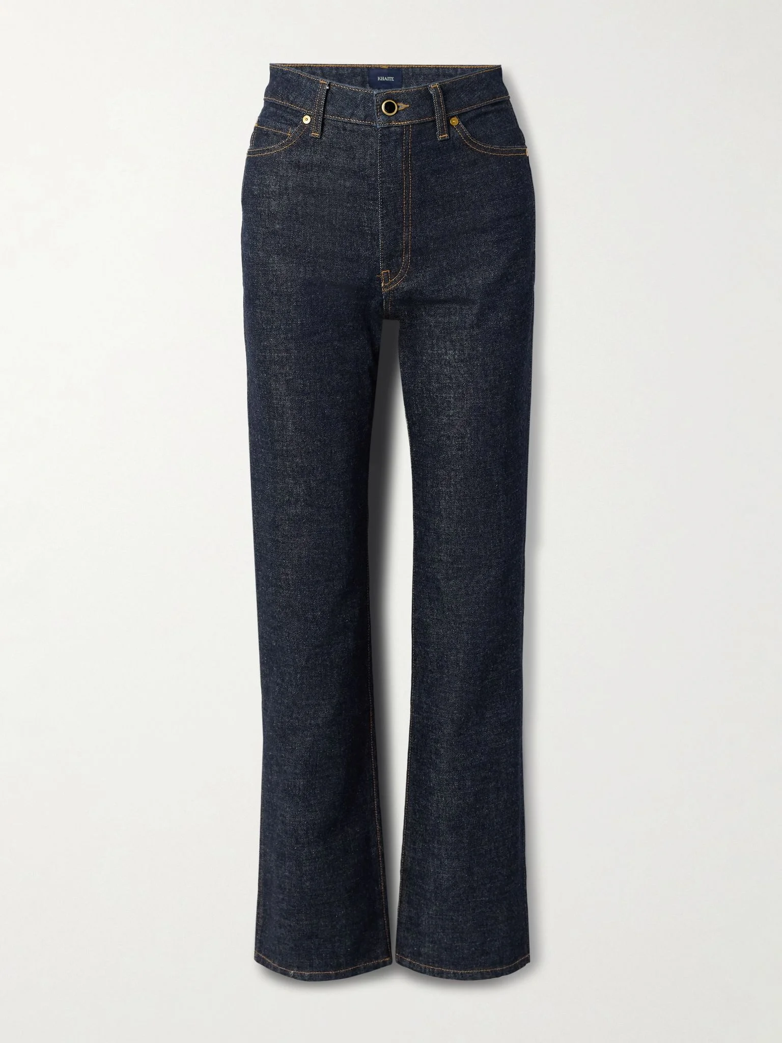 KHAITE's effortless approach is consistent with every design, including the label's denim. These 'Danielle' jeans have a high-rise waistband that makes the straight legs look even sleeker. The contrasting topstitching emphasizes the classic five-pocket construction. Size & Fit - Fits true to size, take your normal size - High-rise, cut for a straight-leg fit - Mid-weight, slightly stretchy fabric - Model is 180cm/ 5'11" and is wearing a size 26 Details & Care - Dark-blue denim - Button and concealed zip fastening at front - 98% cotton, 2% polyurethane - Designer wash: Benson