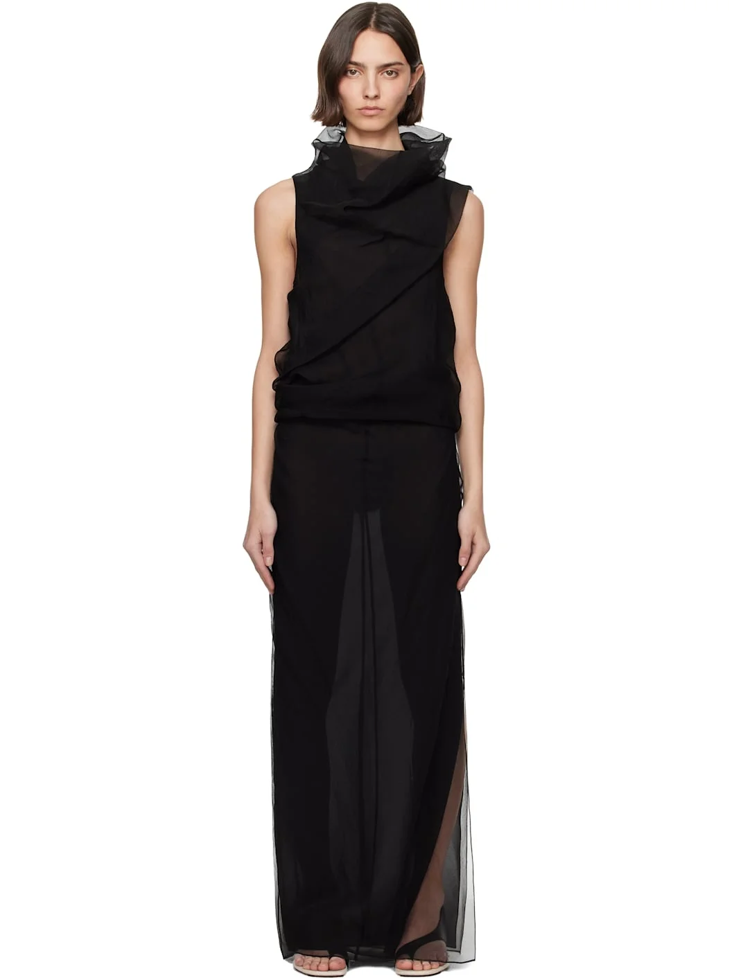 Semi-sheer silk organza maxi dress. Draping throughout. · Asymmetrical construction · Cowl neck · Slit at side seam · Stretch silk faille lining Supplier color: Black Body: 100% silk. Lining: 95% silk, 5% lycra. Made in United States 251914F055009