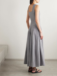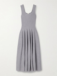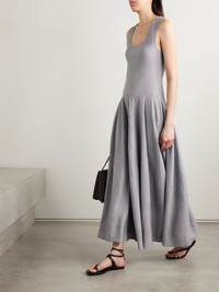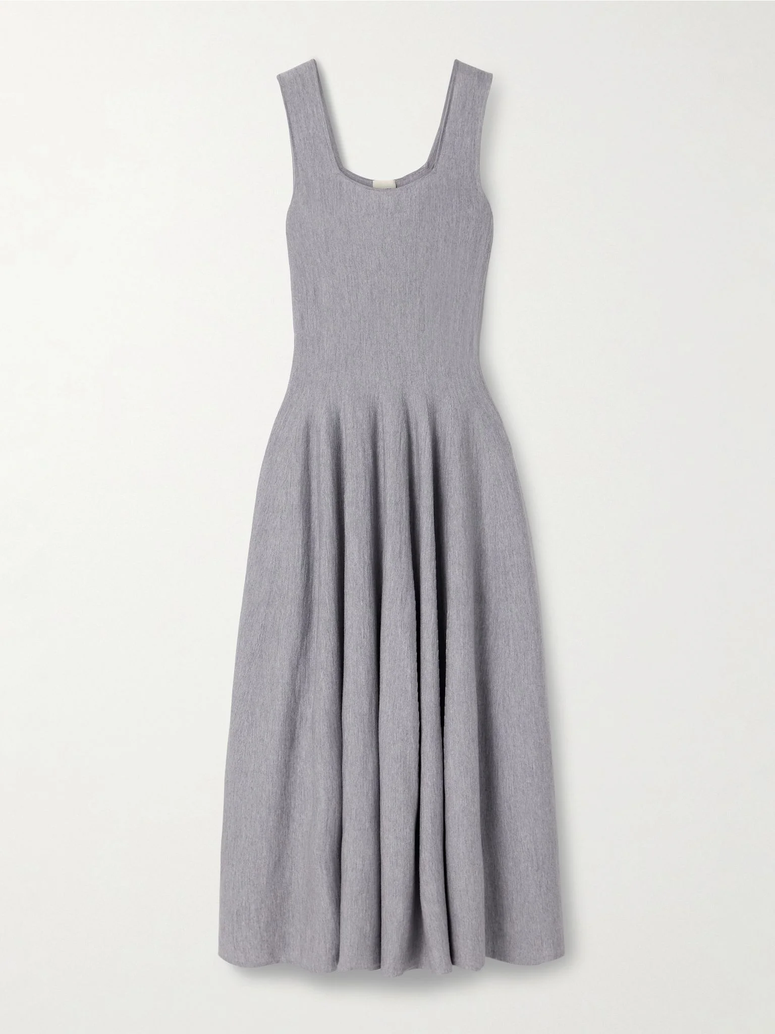 KHAITE's Spring '25 collection focuses on sculptural silhouettes, tactile textures and the tension between softness and structure. This 'Jodie' midi dress is made from wool that hugs your body before gently flaring out to a softly pleated skirt. Size & Fit - Fits true to size, take your normal size - Designed to be fitted at the bust and waist, loose at the hip - Mid-weight, non-stretchy fabric - Model is 180cm/ 5'11" and is wearing a size Small Model measurements: - Bust: 79cm/ 31" - Waist: 61cm/ 24" - Hip: 89cm/ 35" Details & Care - Gray wool - Slips on - 100% virgin wool - Designer color: Mercury