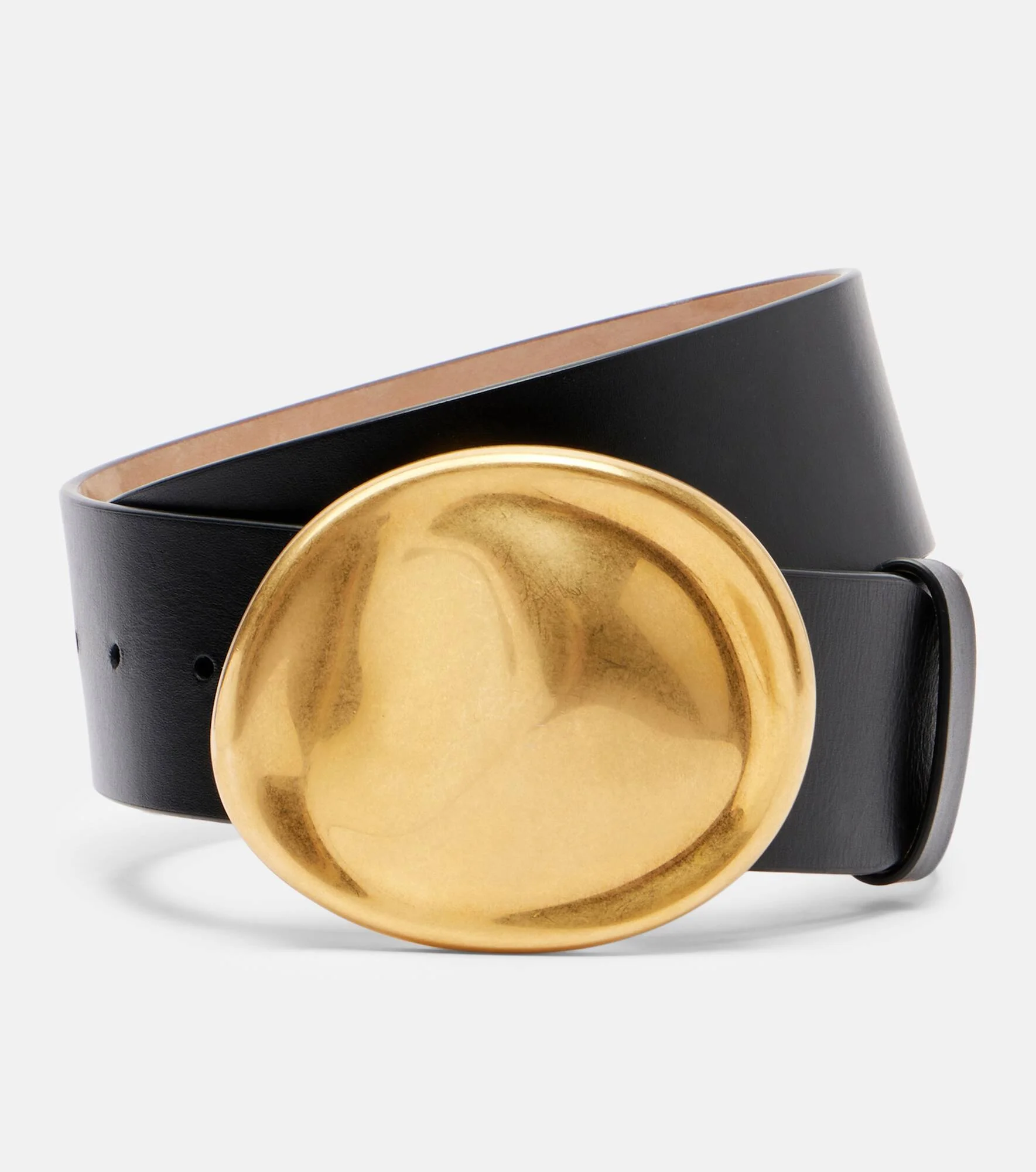 Khaite's minimalist designs exude modern sophistication and effortless elegance. The brand’s refined craftsmanship is showcased in the Keefe belt, crafted from leather and complete with a sculptural gold-toned round buckle. Product Details - Material: leather - Lining: leather - Made in Italy - Color: black - Designer color name: Black - Item color: black - Hardware color: gold - Item number: P01145714 Size & Fit - Width 4,5cm-2" - Buckle width 7,5cm-3"